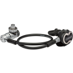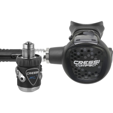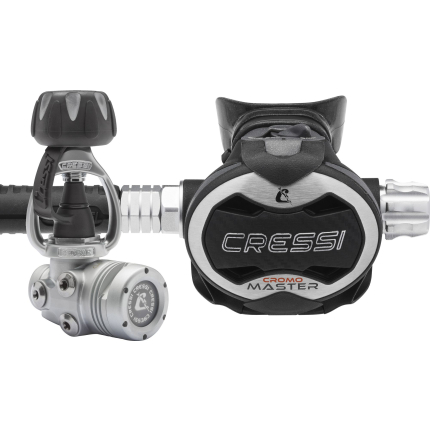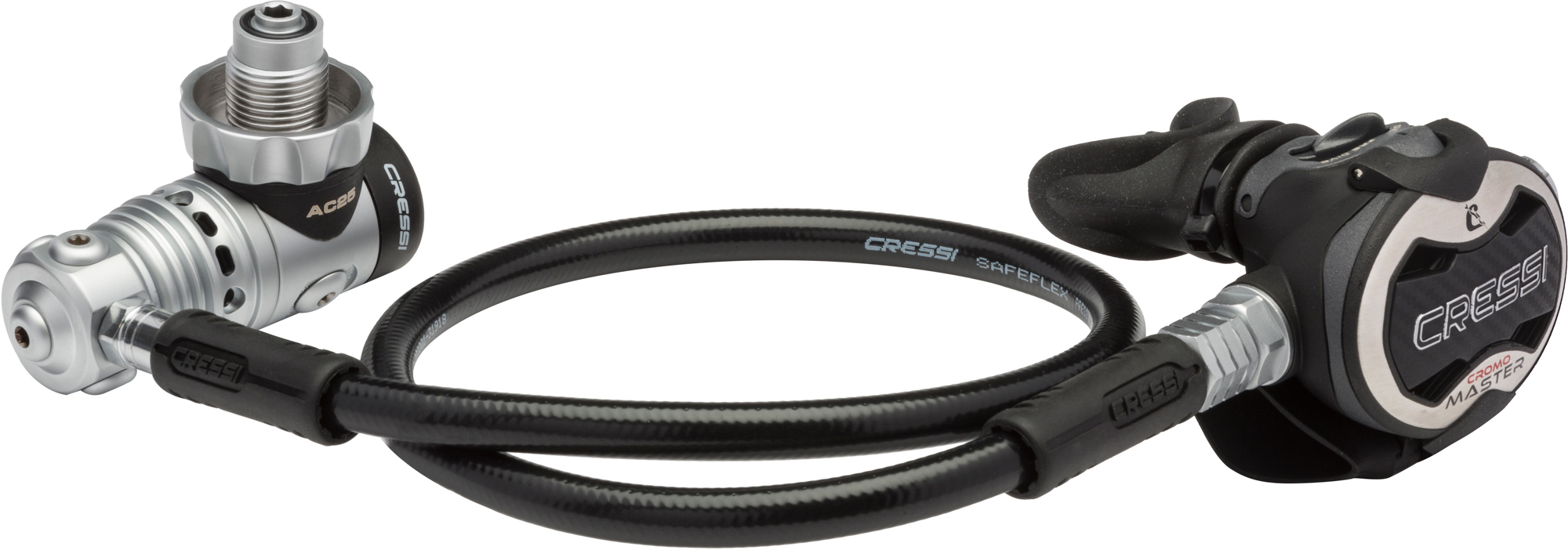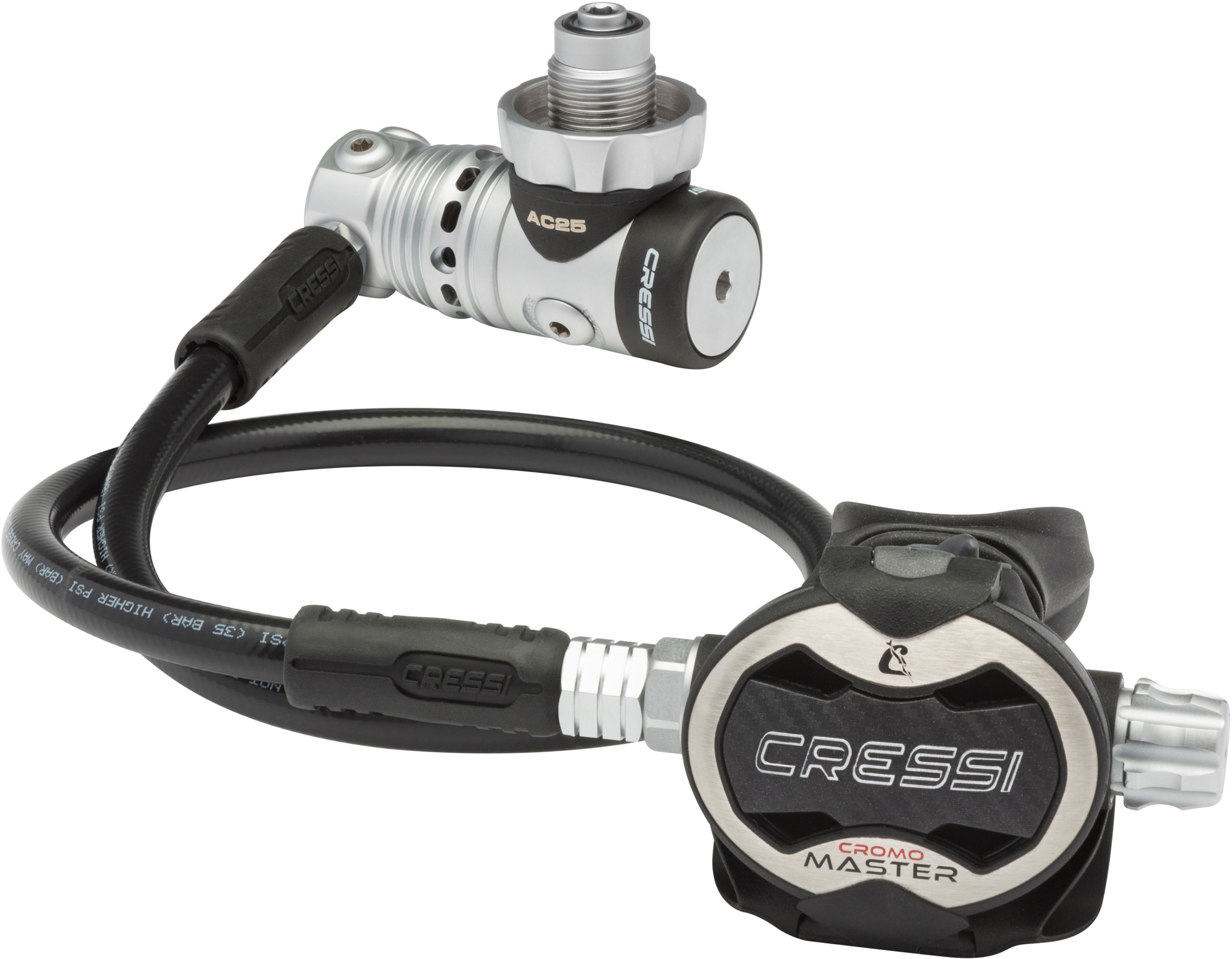 The ac25 is the third generation of cressi’s ip adjustable balanced piston first stage. It features 2 high-pressure ports and 5 lowpressure ports. 4 low-pressure ports are located on a rotating turret that ensures that regulator and instrument connections are always in the right position. The fifth port is a co-axial hi-flow port and is located at the top of the turret. The rotating turret swivels on 360° axis and features 5 low-pressure ports designed to allow the use of more connections without interfering between them. It features the external direct ip adjustment system that can be set using a simple allen key. The hi-flow conic shape filter is the same for int and din. The spring and the spring bush are coated preventing rust. Its technologically advanced design delivers consistent intermediate pressure and high performance even with low tank pressures. The ac25m it features a matte finish, in gun metal-coated brass. It is combined with the master cromo, the pneumatic balanced 2nd stage that features an elliptical shape and a lateral knob for venturi adjustment