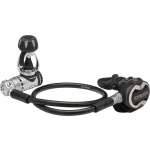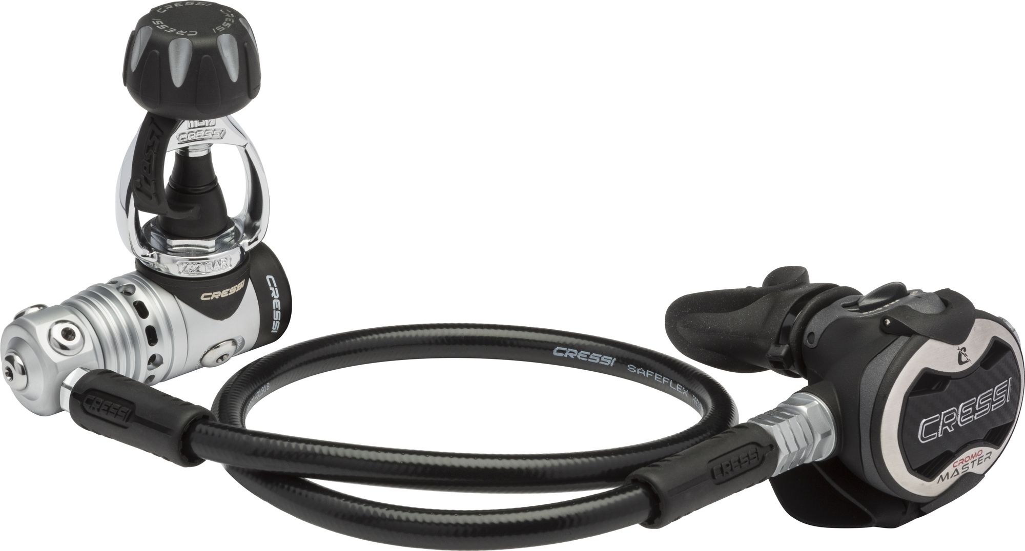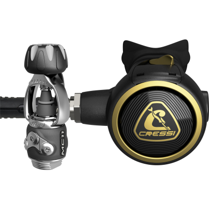 The ac25 is the third generation of cressi’s ip adjustable balanced piston first stage. It features 2 high-pressure ports and 5 lowpressure ports. 4 low-pressure ports are located on a rotating turret that ensures that regulator and instrument connections are always in the right position. The fifth port is a co-axial hi-flow port and is located at the top of the turret. The rotating turret swivels on 360° axis and features 5 low-pressure ports designed to allow the use of more connections without interfering between them. It features the external direct ip adjustment system that can be set using a simple allen key. The hi-flow conic shape filter is the same for int and din. The spring and the spring bush are coated preventing rust. Its technologically advanced design delivers consistent intermediate pressure and high performance even with low tank pressures. The ac25m it features a matte finish, in gun metal-coated brass. It is combined with the master cromo, the pneumatic balanced 2nd stage that features an elliptical shape and a lateral knob for venturi adjustment