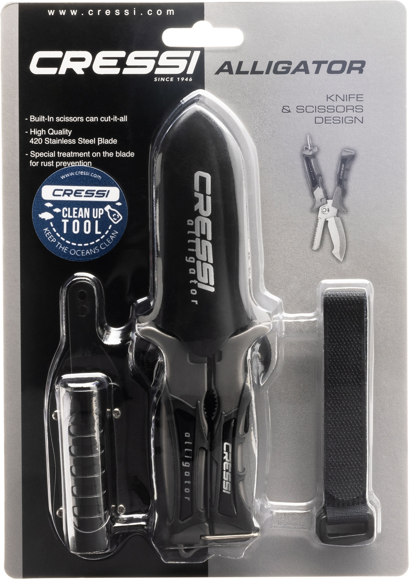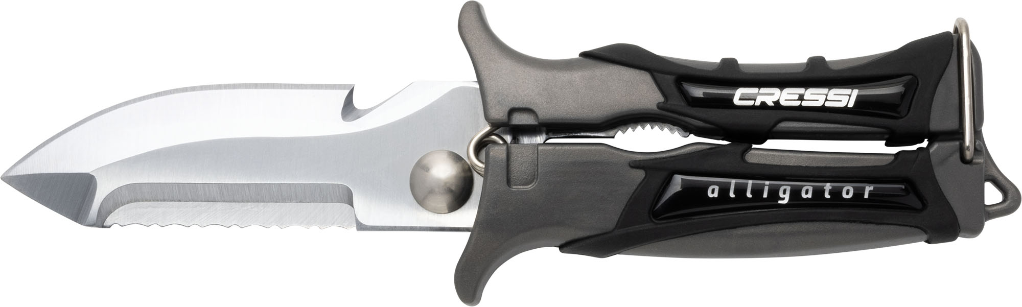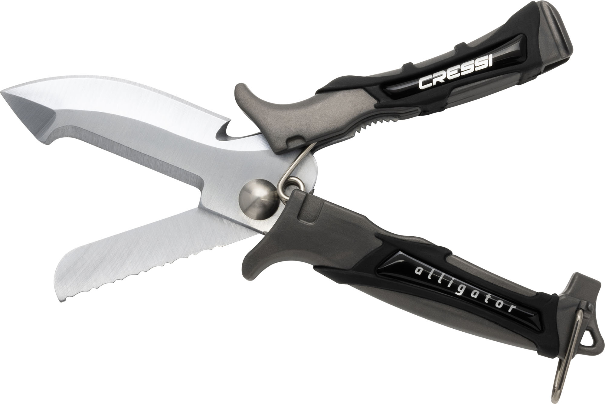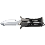 Very practical scissor-knife for all kinds of underwater operations. Made of high-strength stainless steel, it is useful as a scissor, as a smooth-bladed knife like a saw and also has a useful notch as a wire cutter. It includes serrations for use as pliers. Compared to other similar knives, it has the advantage of small size and full use and ergonomics without having to open it up to cut effectively using it as a knife. Great cutting capacity and resistance to oxidation.