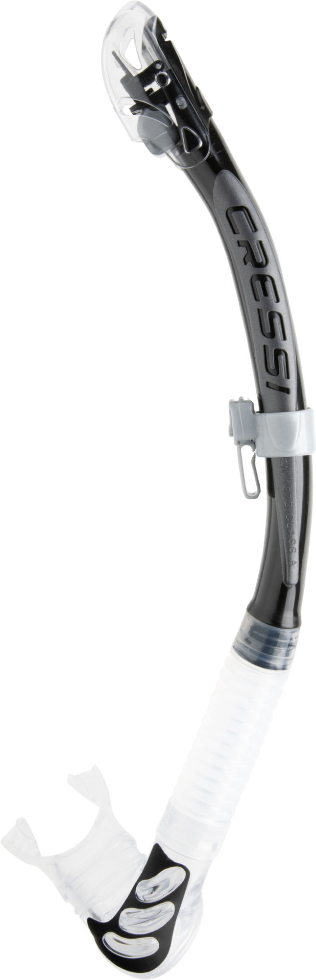 Special snorkel with a special patented “aquastop” valve at the top that keeps water out, making breathing easier and more natural. The tube has an expanded elliptical shape in order to increase comfort and air-delivery capacity. Purge valve and corrugated section near the mouthpiece