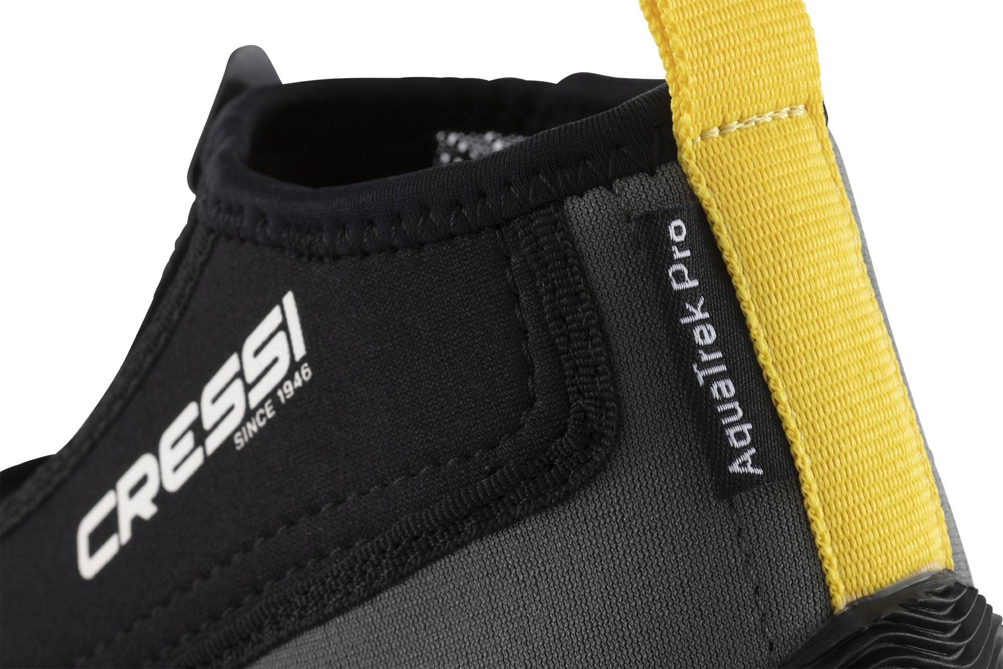 The AquaTrek Pro is a comfortable water shoe engineered for marine environments. Its specialized anti-slip sole ensures stability on various surfaces. The neoprene upper, combined with nylon mesh, facilitates easy slip-on compared to traditional neoprene shoes. Designed for versatility, it transitions seamlessly between water and land activities. Whether walking on rocky shores or sandy beaches, the AquaTrek Pro provides reliable traction and protection. Its lightweight construction and breathable materials enhance comfort during prolonged wear. The practical double puller allows the shoe to be easily slipped on.