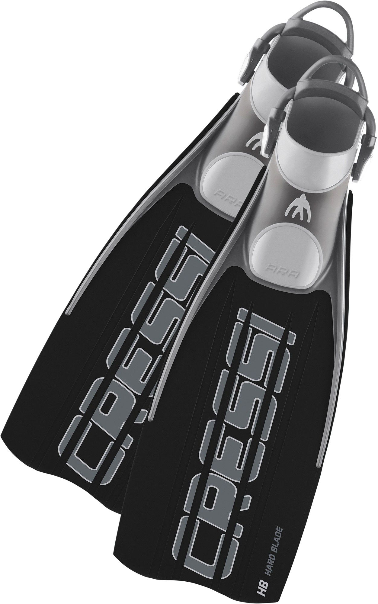 Ara ebs is cressi’s most technical dive fin. It achieves the best performance in compromised situations (currents, etc. ) and allows users to maintain faster forward speeds with quite moderate effort. This fin is based on the construction principles and materials used in freediving and underwater spearfishing fins, and in particular on the concept launched during development of the prestigious gara series. It’s the preferred fin among instructors, professionals, and technical divers, who find it to be a propulsive tool that’s unbeatable in all conditions. The main feature of this fin is its polypropylene blade that provides an excellent response. And weight is no longer a problem. These fins provide more thrust power to a diver’s kicking, which results into an excellent effort/performance ratio. Special grooving for water channelling moulded on the surface provides outstanding stability and direction. The thermorubber foot pocket (with varying levels of hardness) is very comfortable to wear and a proper fit is ensured by ergonomic design. The heel strap, an exclusive cressi design, is a special round bungee cord band that perfectly adjusts to all foot sizes and shapes and provides a comfortable, practical and manageable fastening. It features a special ample slot for easy don and doff even when wearing thick gloves for cold-water diving