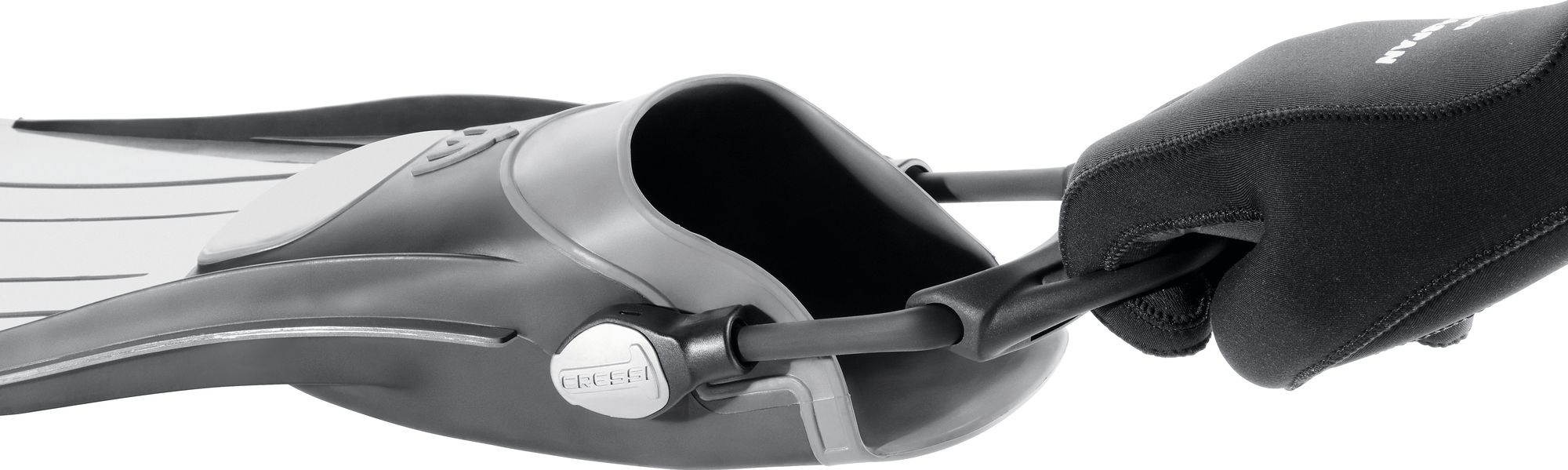 Ara ebs is cressi’s most technical dive fin. It achieves the best performance in compromised situations (currents, etc. ) and allows users to maintain faster forward speeds with quite moderate effort. This fin is based on the construction principles and materials used in freediving and underwater spearfishing fins, and in particular on the concept launched during development of the prestigious gara series. It’s the preferred fin among instructors, professionals, and technical divers, who find it to be a propulsive tool that’s unbeatable in all conditions. The main feature of this fin is its polypropylene blade that provides an excellent response. And weight is no longer a problem. These fins provide more thrust power to a diver’s kicking, which results into an excellent effort/performance ratio. Special grooving for water channelling moulded on the surface provides outstanding stability and direction. The thermorubber foot pocket (with varying levels of hardness) is very comfortable to wear and a proper fit is ensured by ergonomic design. The heel strap, an exclusive cressi design, is a special round bungee cord band that perfectly adjusts to all foot sizes and shapes and provides a comfortable, practical and manageable fastening. It features a special ample slot for easy don and doff even when wearing thick gloves for cold-water diving