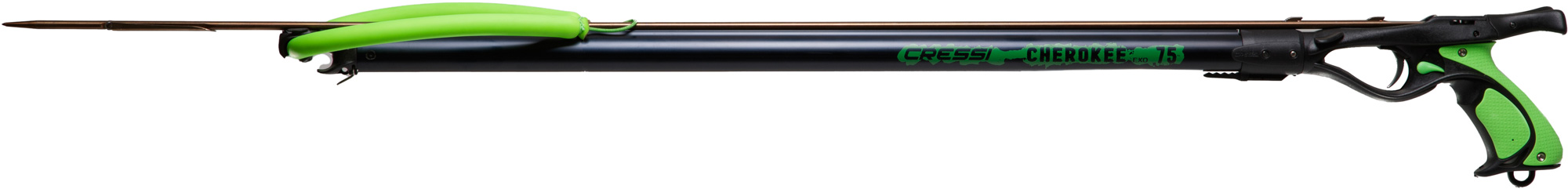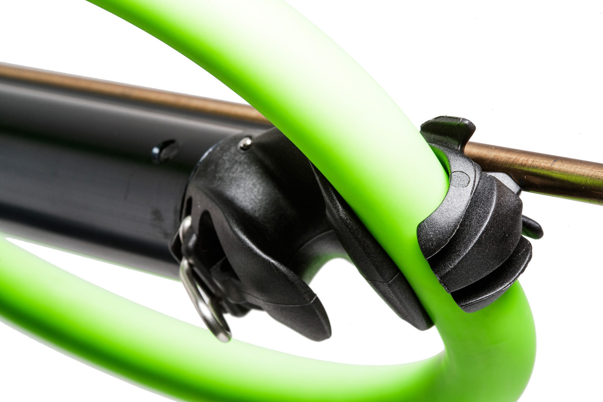 Anticorodal black frame with integrated spear guide, grip made of engineering plastic reinforced with glass fibre, high or low soft sternal support. Ultra-light triggering case with trigger, release mechanism and line ring on the side in aisi 316, machined from solid with a cnc process. The shock absorber makes silent the release of the shaft. Reversible side-safety mechanism. Reinforced reel with steel pin buckle. Head for double elastic with magnetic spear lock: as soon as the spear is put in place, it is held by two magnets mounted in a watertight chamber. This characteristic guarantees maximum speed of reset without the disadvantages of conventional mechanical restraint systems. The speargun is supplied with a 16 mm natural latex elastic, with dyneema wishbone