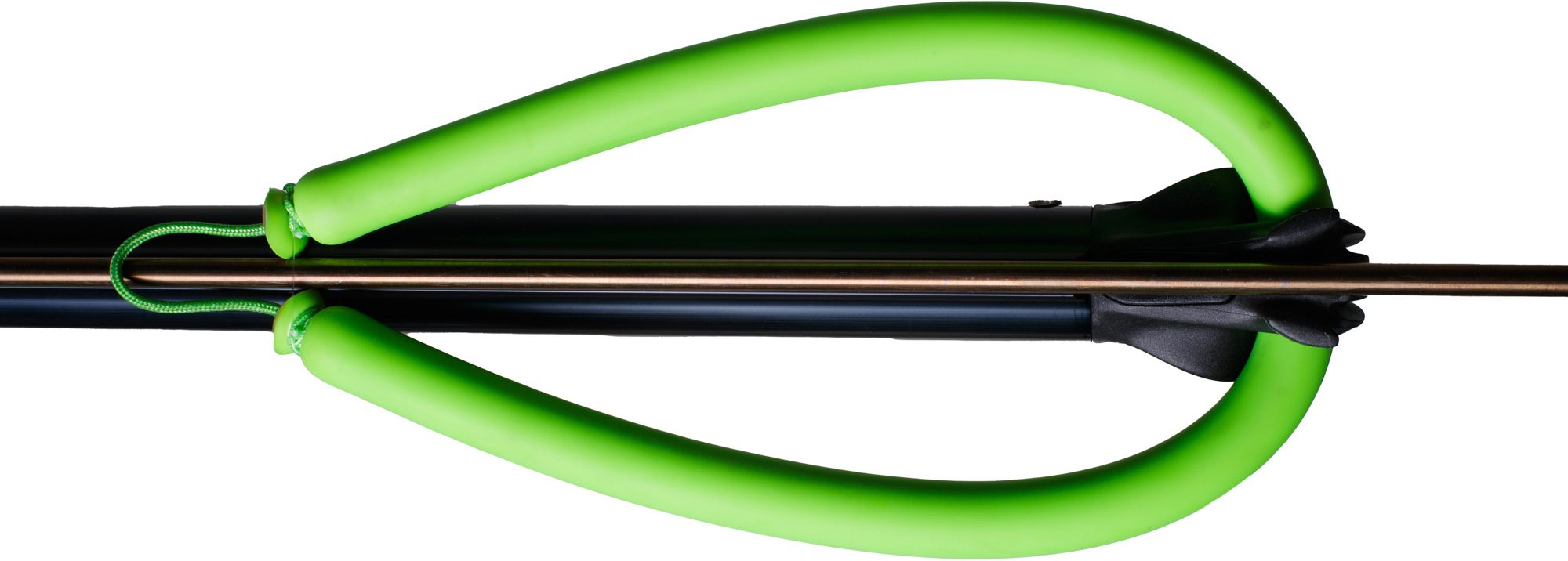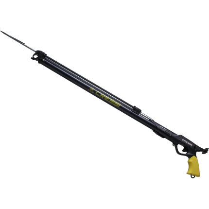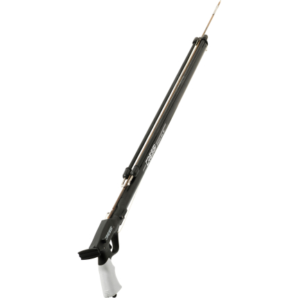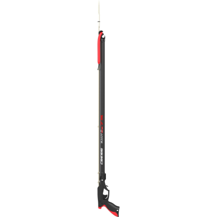 Anticorodal black frame with integrated spear guide, grip made of engineering plastic reinforced with glass fibre, high or low soft sternal support. Ultra-light triggering case with trigger, release mechanism and line ring on the side in aisi 316, machined from solid with a cnc process. The shock absorber makes silent the release of the shaft. Reversible side-safety mechanism. Reinforced reel with steel pin buckle. Head for double elastic with magnetic spear lock: as soon as the spear is put in place, it is held by two magnets mounted in a watertight chamber. This characteristic guarantees maximum speed of reset without the disadvantages of conventional mechanical restraint systems. The speargun is supplied with a 16 mm natural latex elastic, with dyneema wishbone