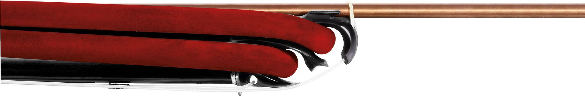 Anticorodal black frame with integrated spear guide, grip made of engineering plastic reinforced with glass fibre, high or low soft sternal support. Composite material release mechanism with trigger, release tooth and lateral guide line release obtained from the base. The shock absorber makes silent the release of the shaft. Reversible side safety mechanism. Reinforced reel with steel pin buckle. Head for double elastic with magnetic spear lock: as soon as the spear is put in place, it is held by two magnets mounted in a watertight chamber. This characteristic guarantees maximum speed of reset without the disadvantages of conventional mechanical restraint systems
