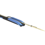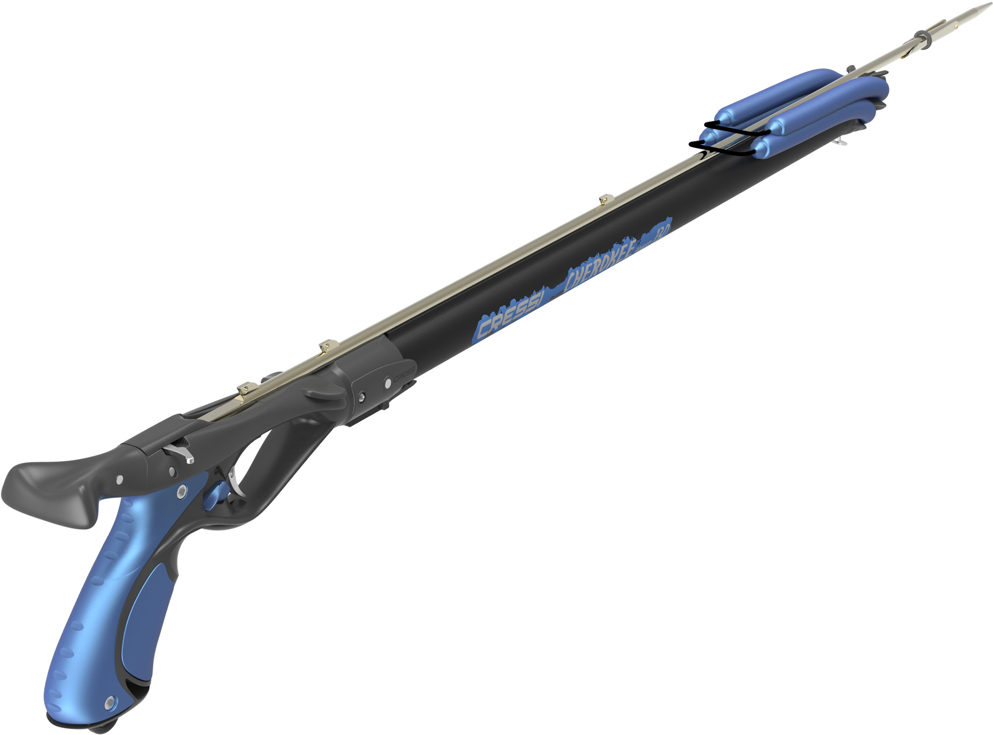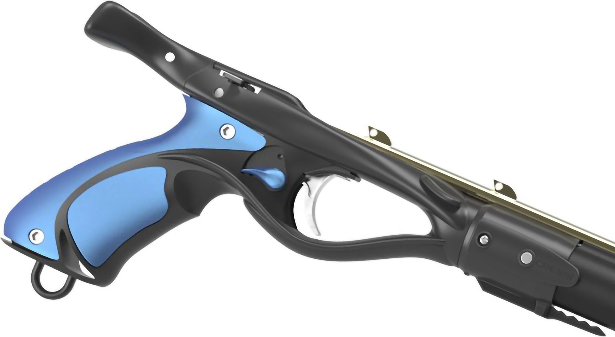Anticorodal black frame with integrated spear guide, grip made of engineering plastic reinforced with glass fibre, interchangeable high or low soft sternal support. Ultra-light triggering case with trigger, release mechanism and line ring on the side in aisi 316, machined from solid with a cnc process. The shock absorber makes silent the release of the shaft. Reversible side-safety mechanism. Reinforced reel with steel pin buckle. Head for double elastic with magnetic spear lock: as soon as the spear is put in place, it is held by two magnets mounted in a watertight chamber. This characteristic guarantees maximum speed of reset without the disadvantages of conventional mechanical restraint systems. The speargun is supplied with double 16 mm natural latex band, with dyneema wishbone