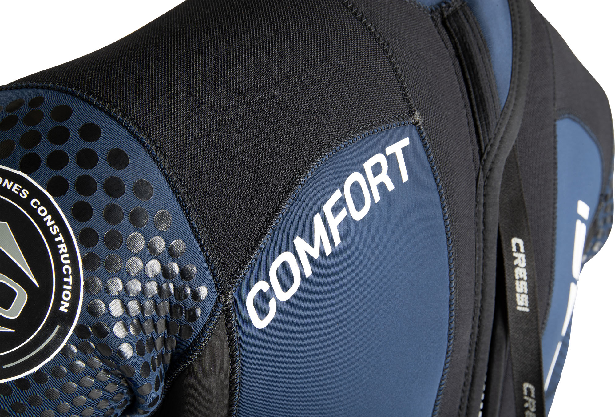 The anatomically considered collar design has a 120º preformed cutaway, allowing for a more natural fit that reduces pressure on the neck when looking down to adjust equipment or check gauges.