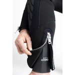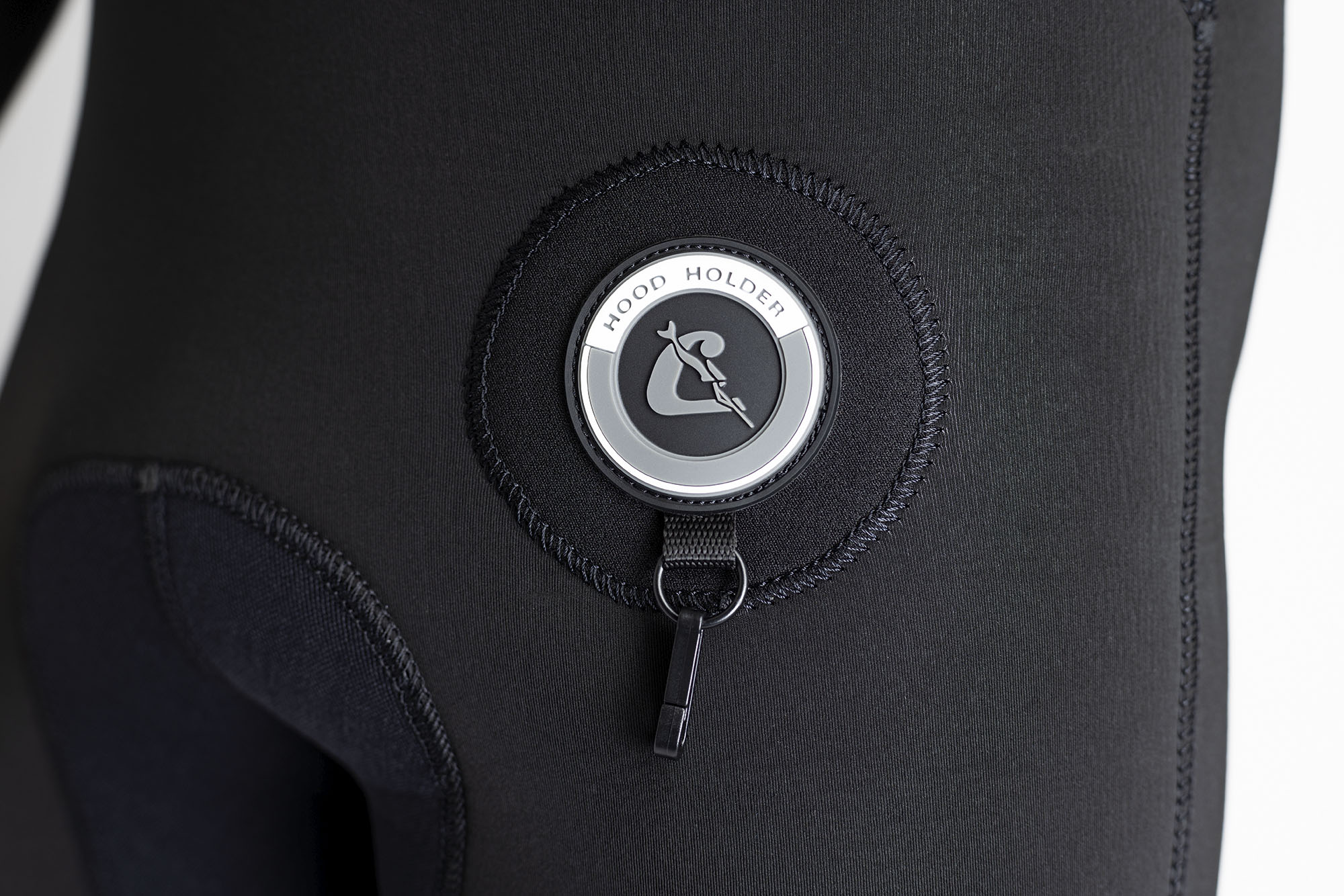 A high-volume thigh pocket on the right leg has two compartments and an integrated D-ring for securing accessories. A dedicated hood holder keeps your hood secure between dives.