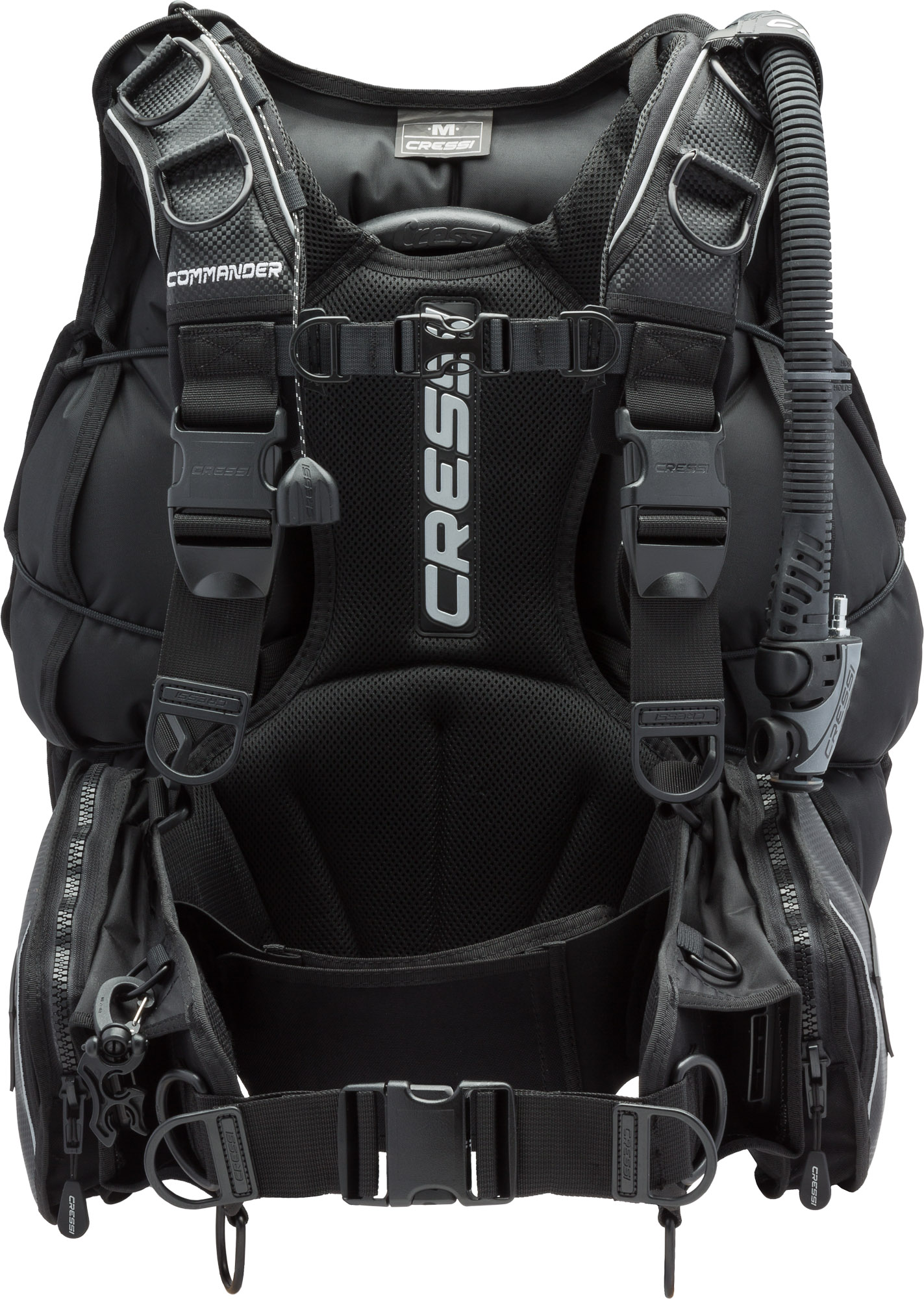Unlike a pure wing-and-harness setup, the Commander Evo features a cummerbund-style waist strap with integrated weight pockets. Using Cressi’s Flat Lock Aid quick-release design, weights are held securely in place but are easy to release when needed. Rear weight pockets on the cylinder band allow for fine-tuning your trim.