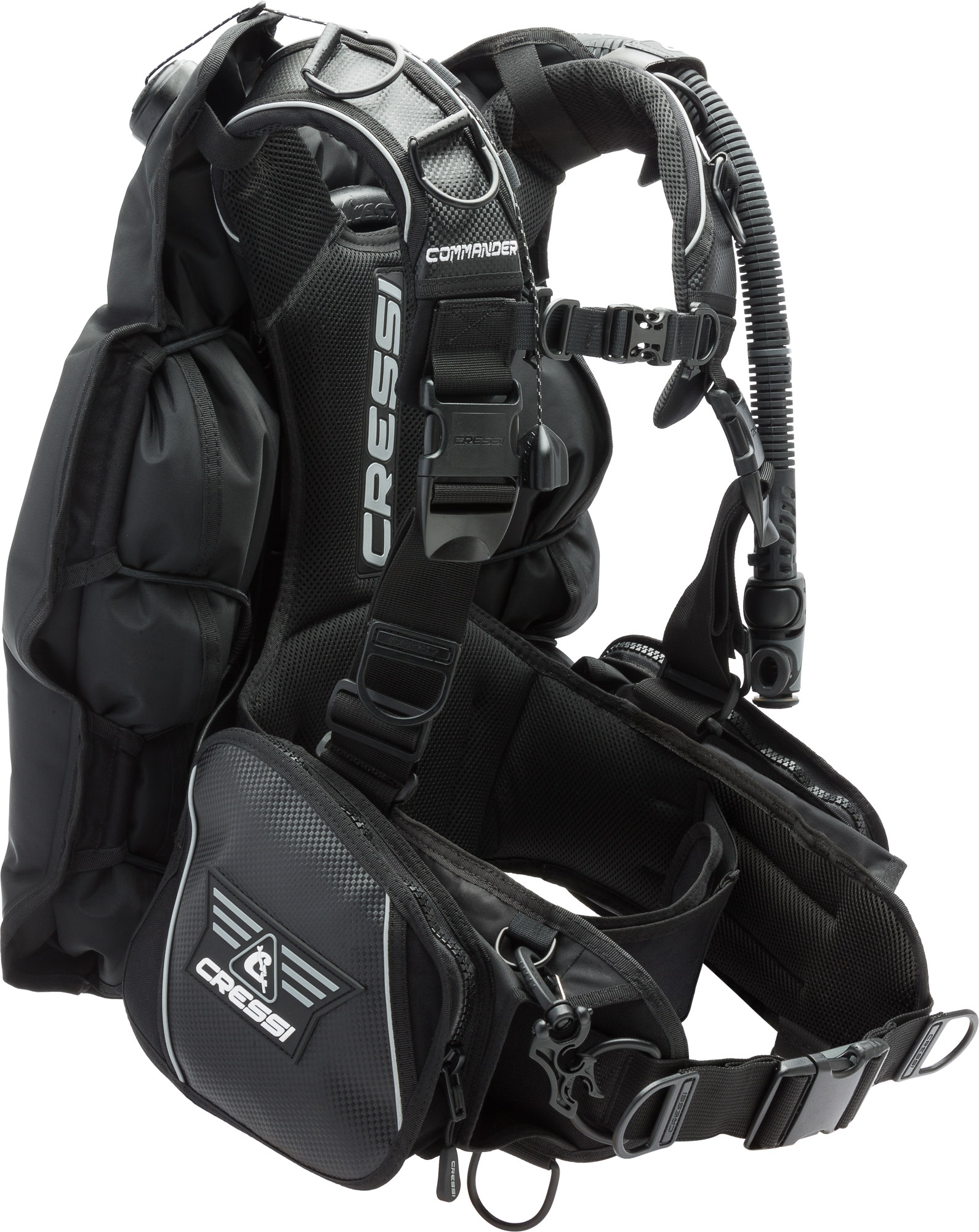 Unlike a pure wing-and-harness setup, the Commander Evo features a cummerbund-style waist strap with integrated weight pockets. Using Cressi’s Flat Lock Aid quick-release design, weights are held securely in place but are easy to release when needed. Rear weight pockets on the cylinder band allow for fine-tuning your trim.