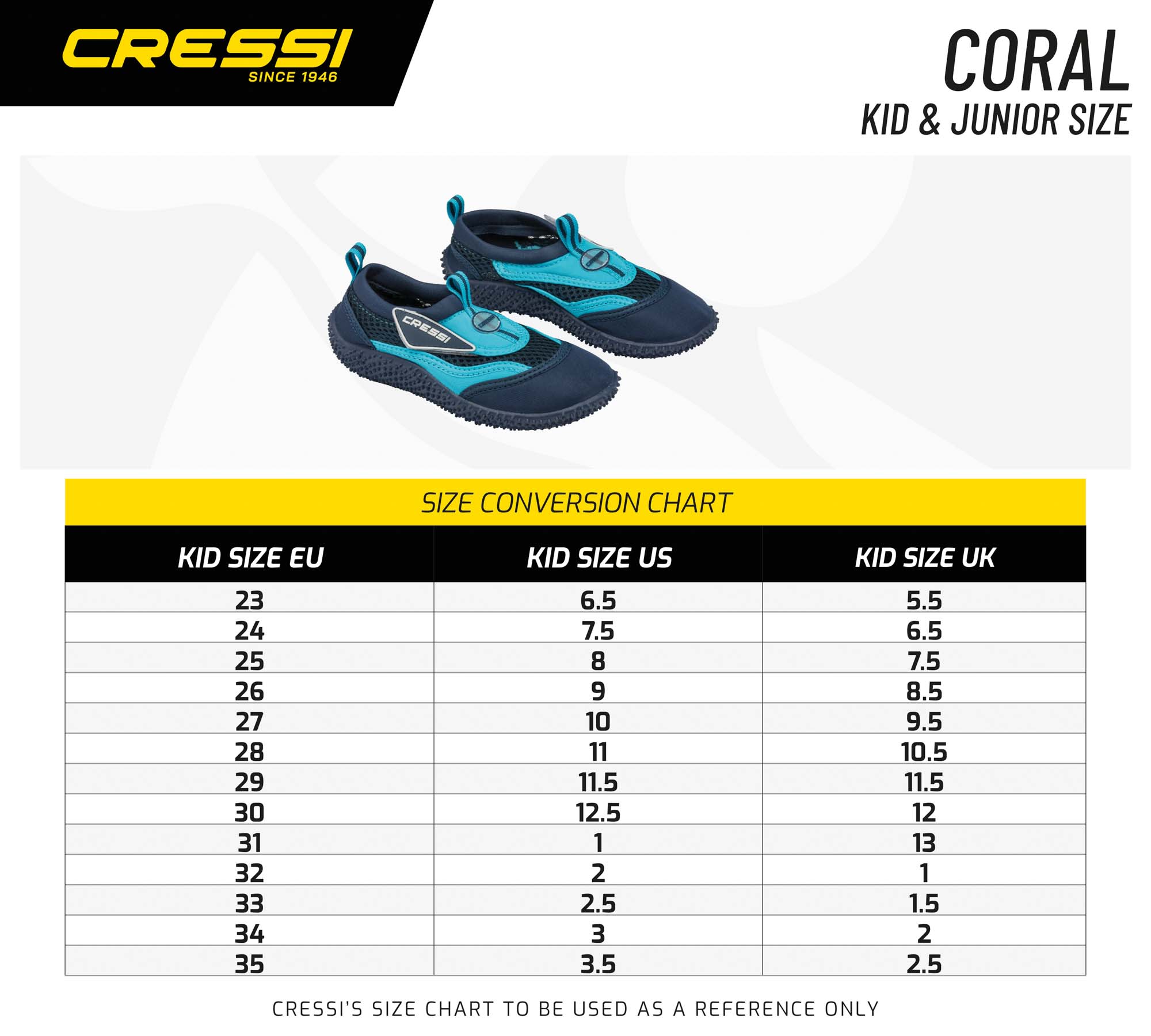 Cressi coral jr are form-fitting and lightweight beach shoes. Suitable for walking on the street, near water and in water, excellent for boating. They’ll protect your feet from scorching sand, rocks, sea-urchins, reefs, and rough sea beds. Can be worn without socks. The upper, in neoprene and honeycomb fabric, lets the foot breathe. The flexible sole protects the arch of the foot from contact with the ground and is antigrip