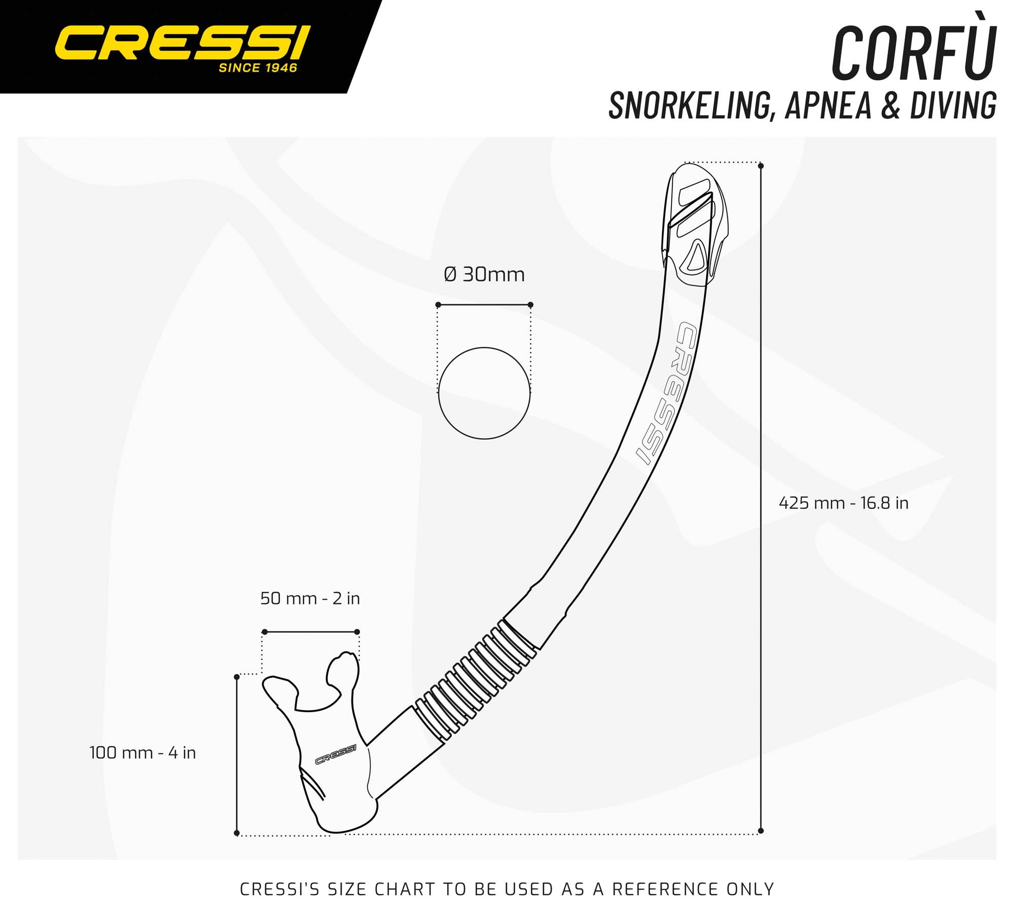 Snorkel designed mainly for snorkeling, apnea and diving. The tube (curved shape and soft material) has a variable section and in the upper part ends with an innovative splash guard, which drastically reduces water entry from waves, without interfering with breathing. The mouthpiece, made of soft silicone, has an angle studied in a particularly ergonomic way, with a reduced bite size for prolonged use without gum fatigue. The mouthpiece body consists of two pieces, with an inclination that ensures better and faster water drainage. A lower purge valve enables instant clearing when needed