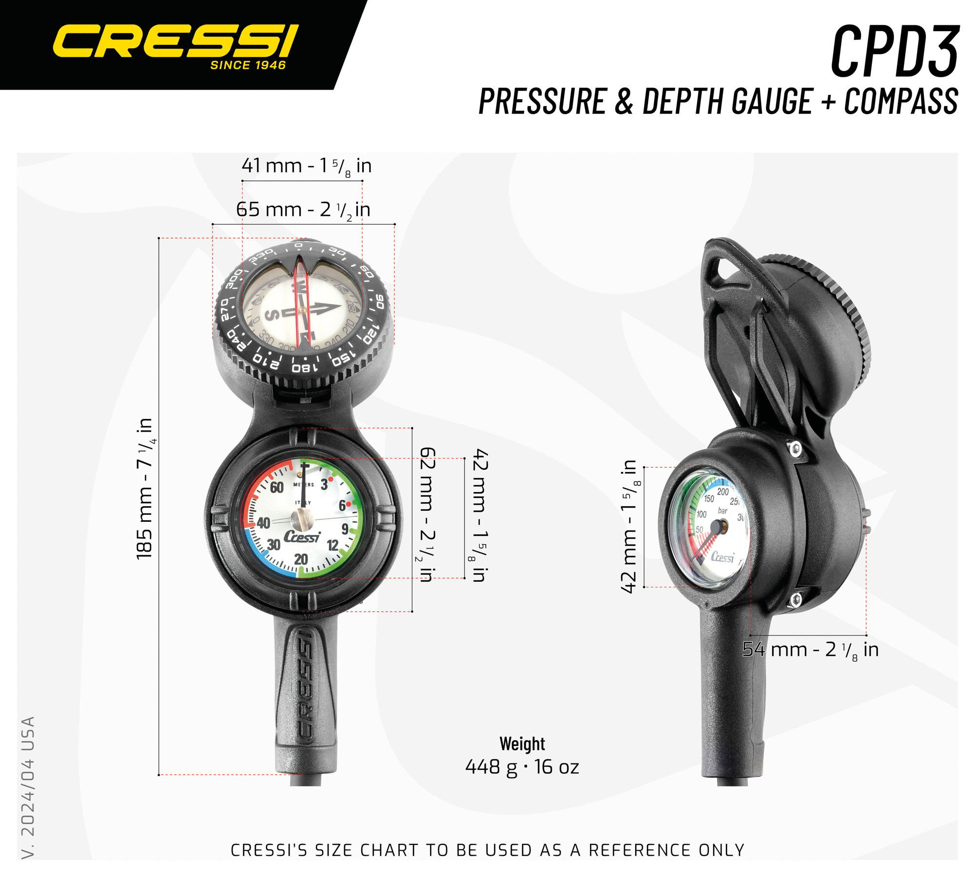 • Mini-depth gauge reads to 70 meters.