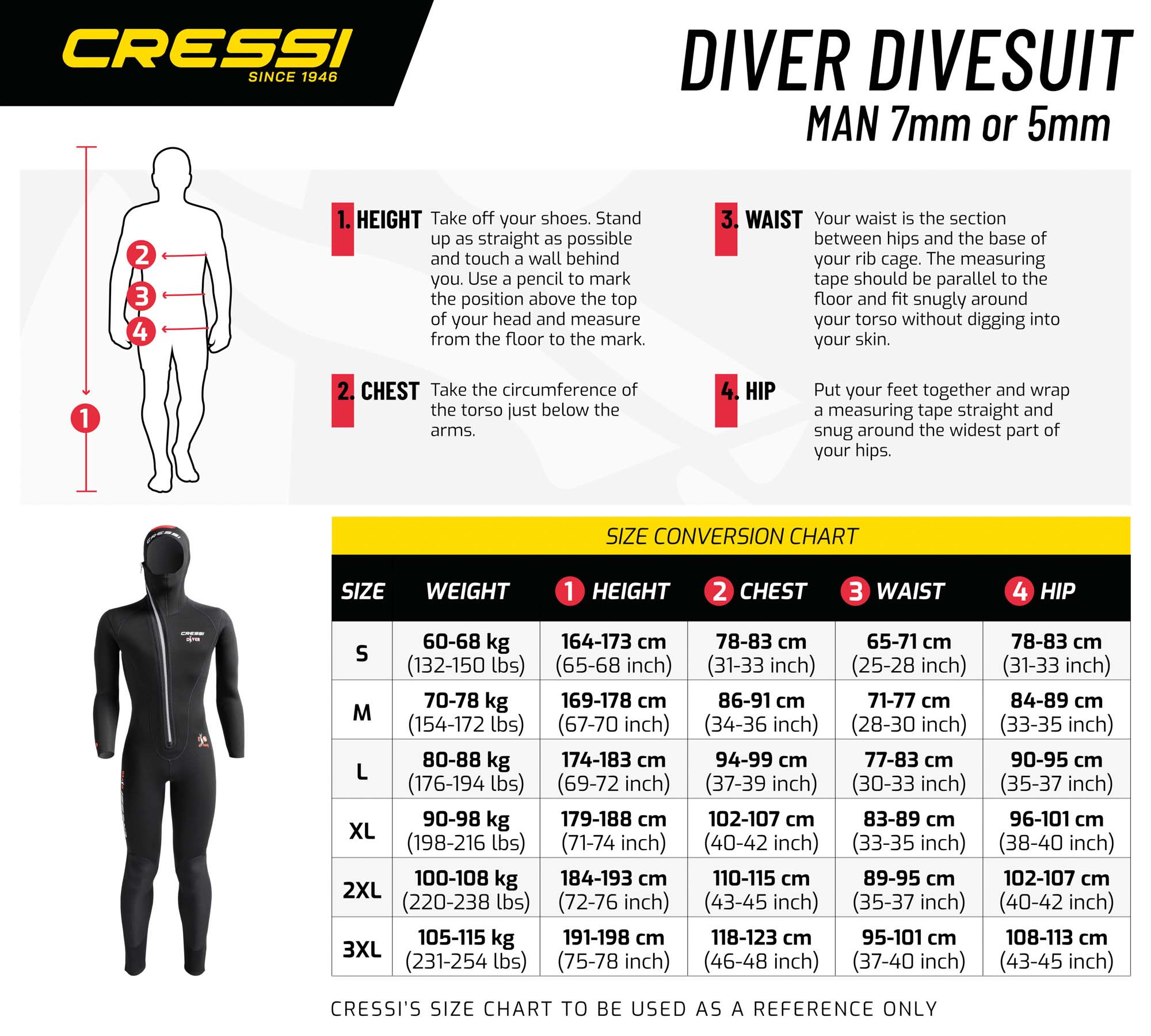 The Cressi Diver is a one-piece neoprene wetsuit with an integrated hood for the whole family, featuring male, female and junior-specific fits.