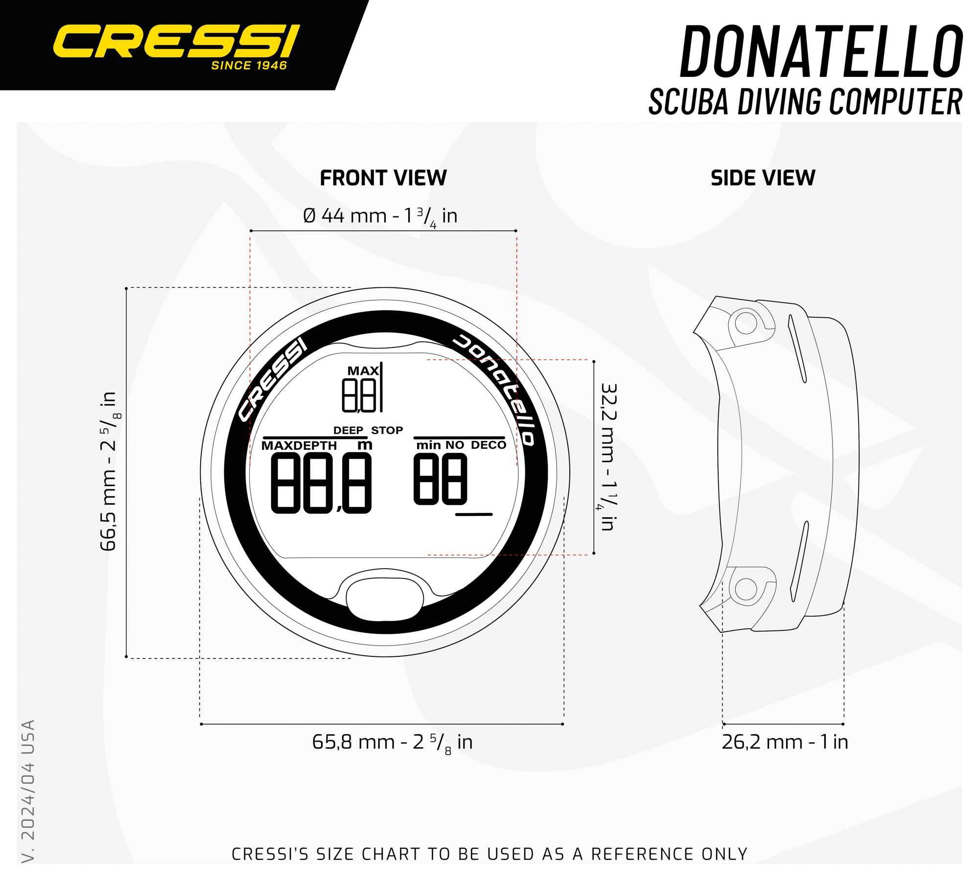 Designed with recreational and free divers in mind, the Donatello has four operating modes: Air, Nitrox, Gauge and Free.