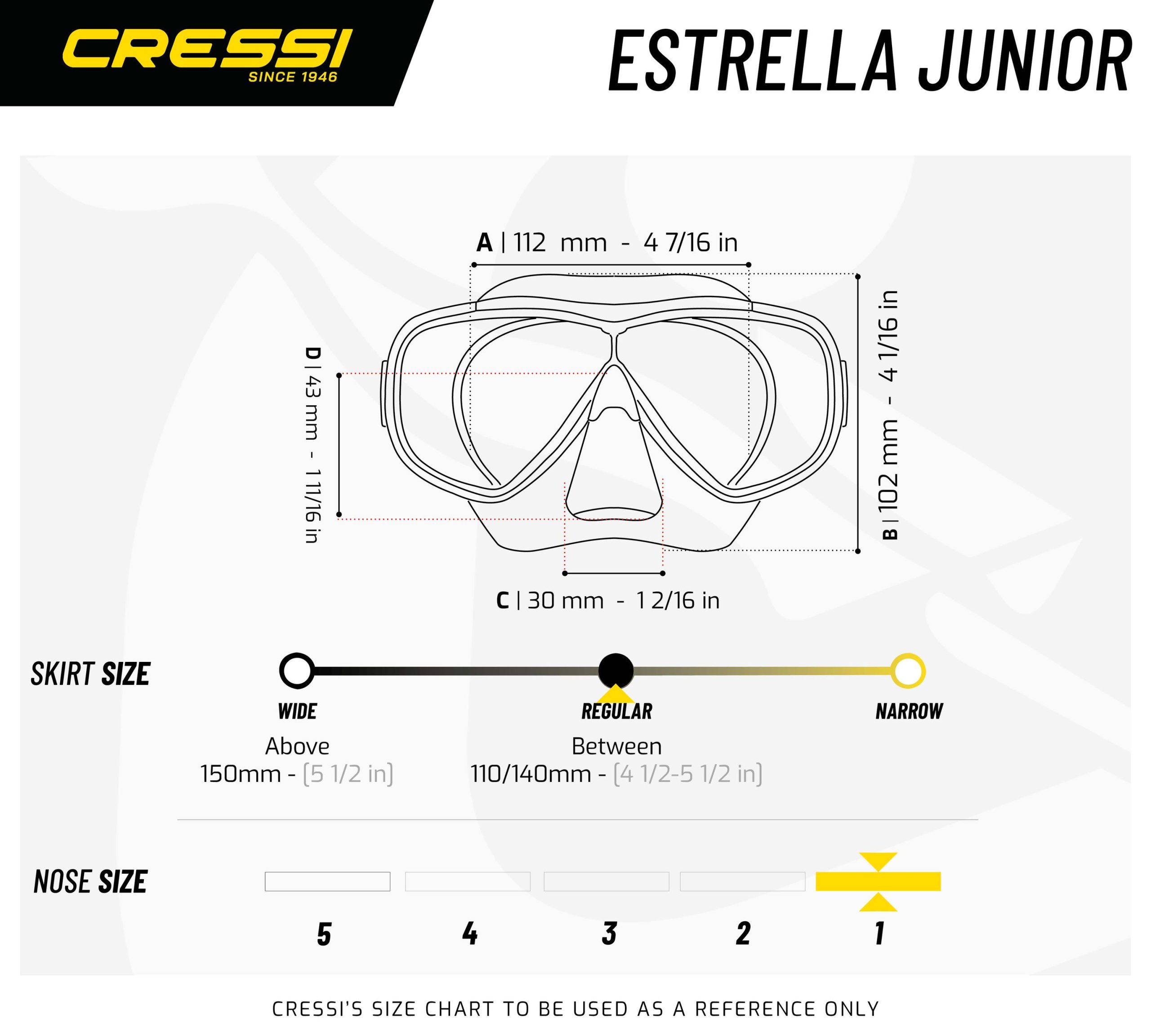 This new version of the estrella has an elasticated fabric strap without adjustment buckles to make it easier for children to put on and to avoid pulling the hair. The traditional snorkel clip has been replaced with a loop created with the fabric strap supporting and positioning the snorkel. The same mask can be fitted with both the silicon and fabric straps via an attachment pin