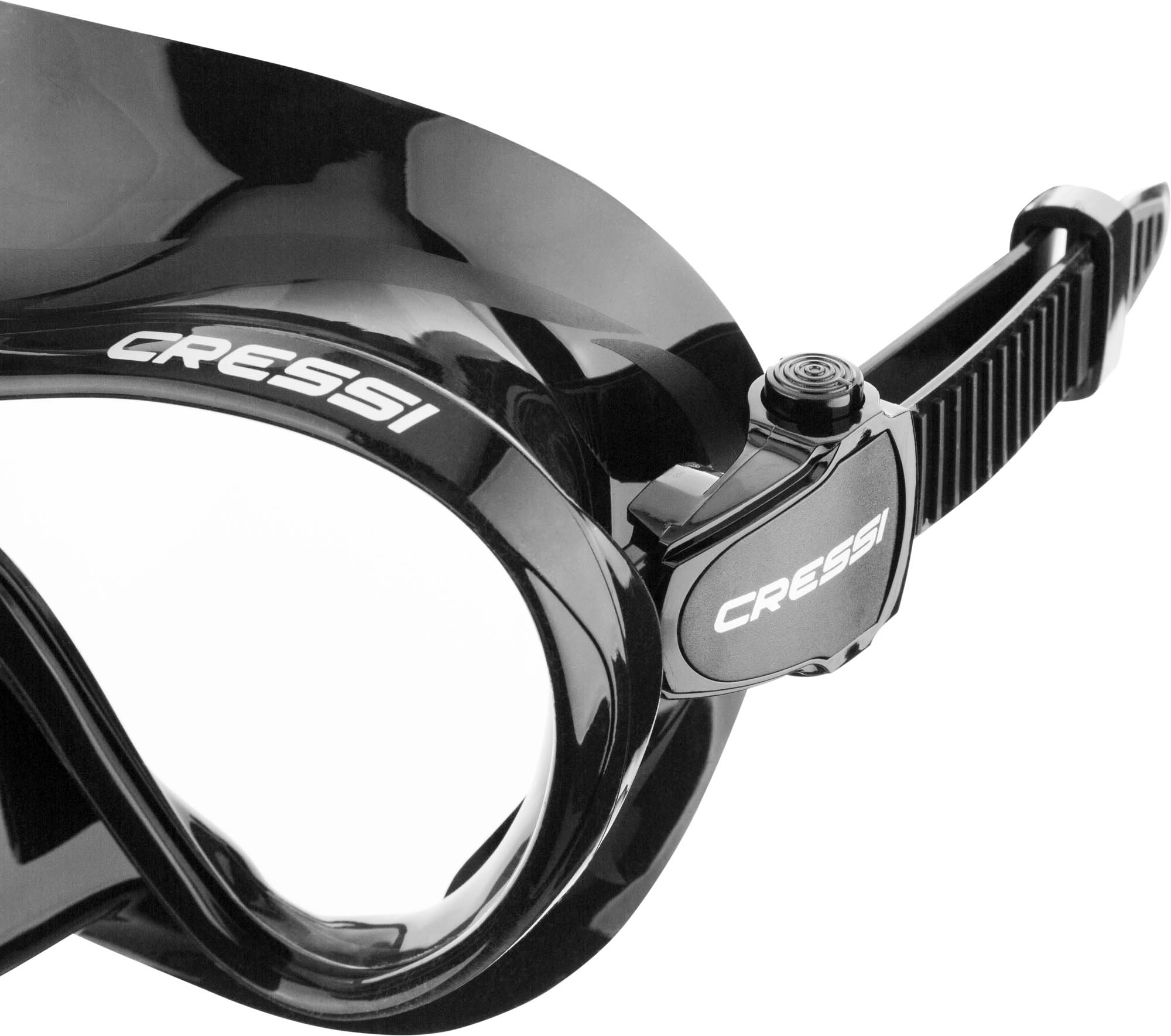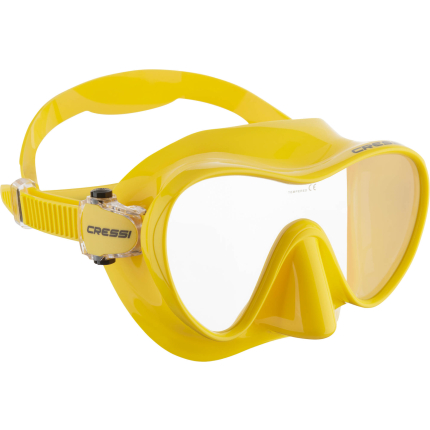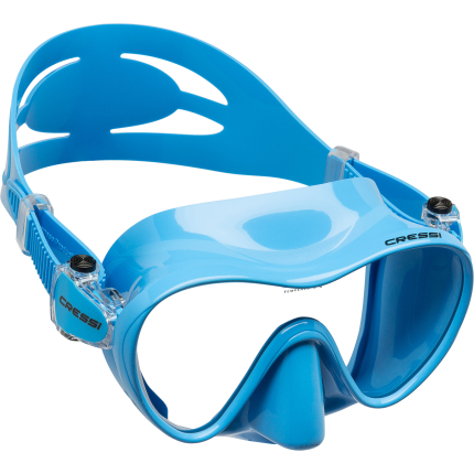 The F1 is a frameless mask, available in many colors. The glass is incorporated directly into the silicone, without a disturbing frame and like almost all frameless masks, it can be folded flat for transport, very practical. It is made of high-quality, very soft and comfortable liquid silicone. The low internal volume allows for effortless blowing out and the very precisely adjustable strap buckles are flexibly incorporated into the silicone body. It is a single-lens mask with a very large field of vision.