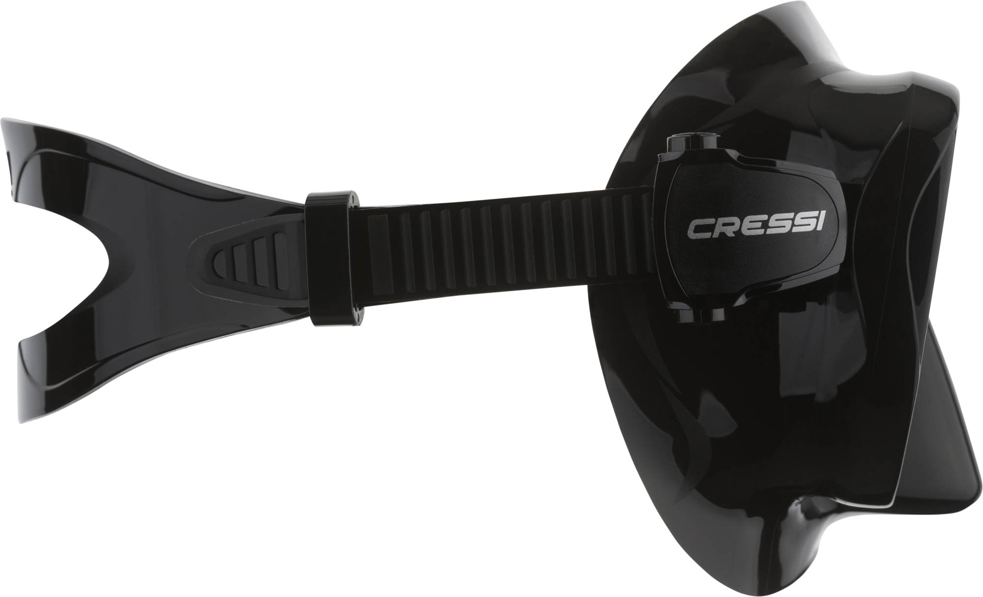 The F1 is a frameless mask, available in many colors. The glass is incorporated directly into the silicone, without a disturbing frame and like almost all frameless masks, it can be folded flat for transport, very practical. It is made of high-quality, very soft and comfortable liquid silicone. The low internal volume allows for effortless blowing out and the very precisely adjustable strap buckles are flexibly incorporated into the silicone body. It is a single-lens mask with a very large field of vision.