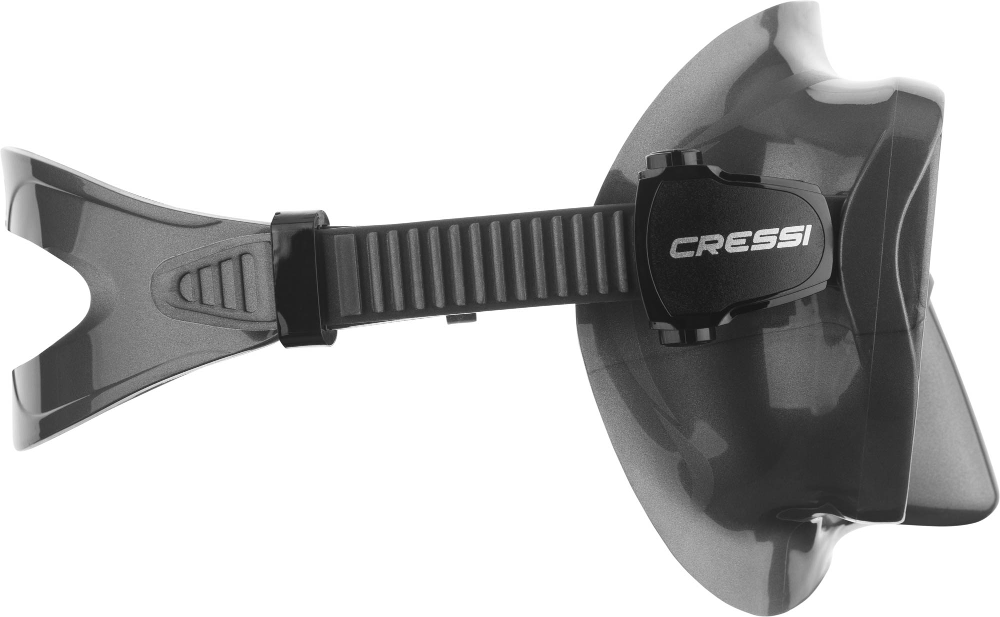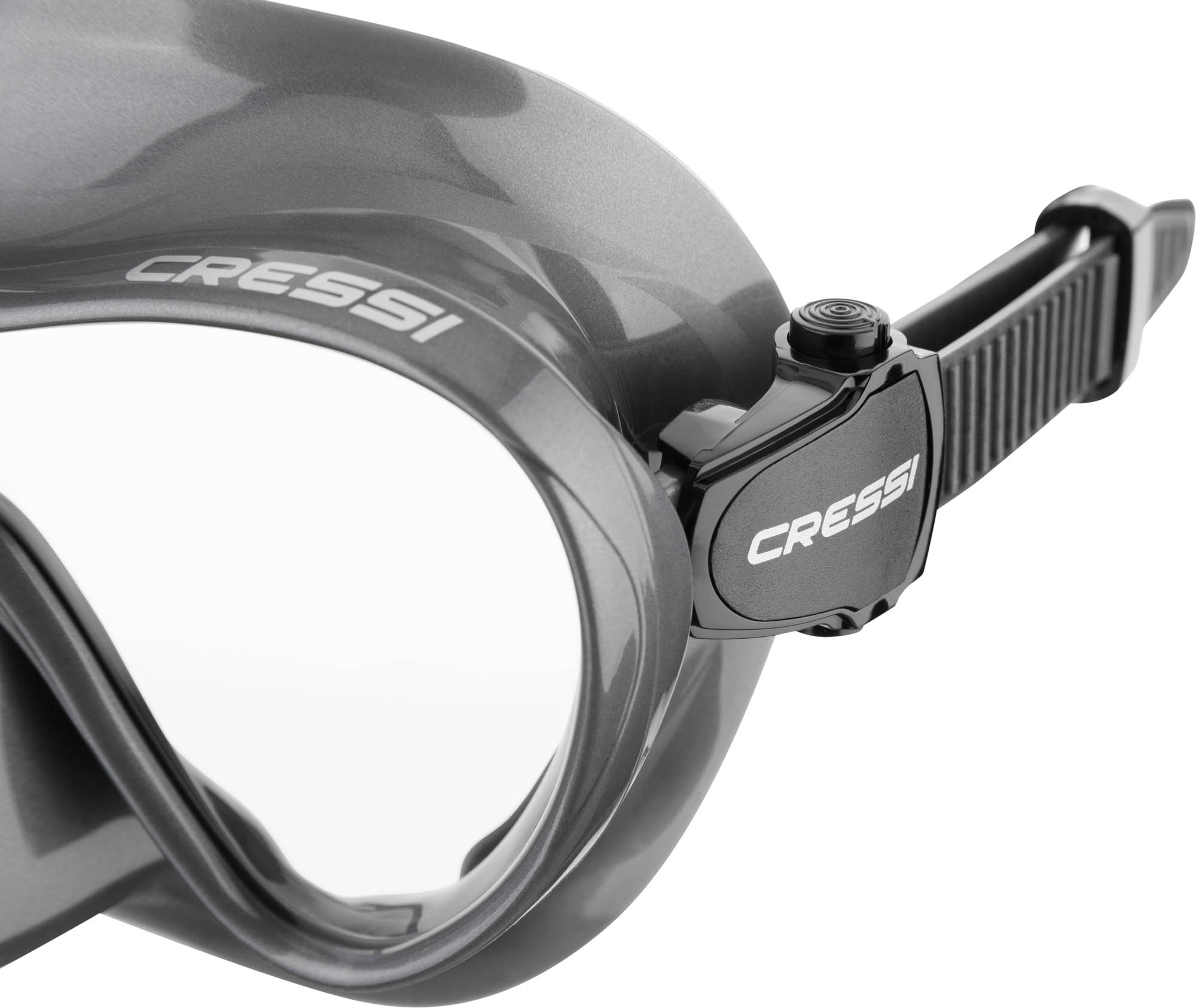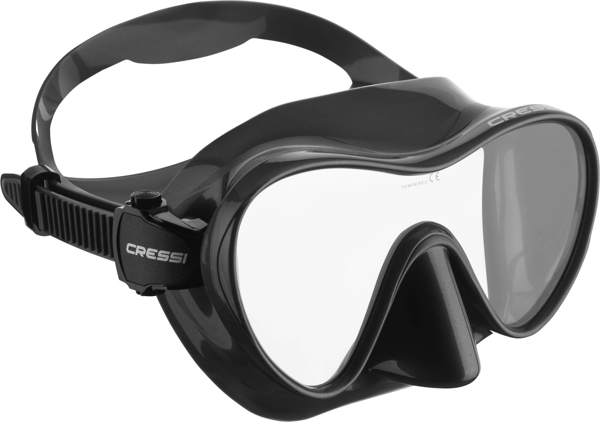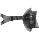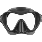 The F1 is a frameless mask, available in many colors. The glass is incorporated directly into the silicone, without a disturbing frame and like almost all frameless masks, it can be folded flat for transport, very practical. It is made of high-quality, very soft and comfortable liquid silicone. The low internal volume allows for effortless blowing out and the very precisely adjustable strap buckles are flexibly incorporated into the silicone body. It is a single-lens mask with a very large field of vision.