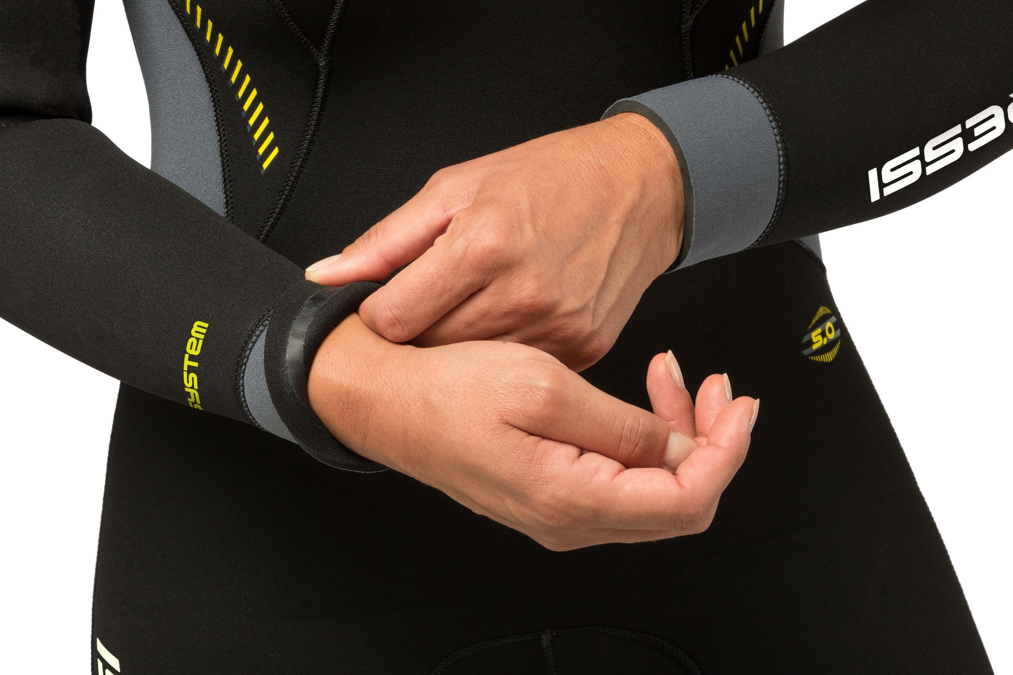 • Water-stop system with inner ring seals reduces water entry at the wrists and ankles for superior thermal protection.