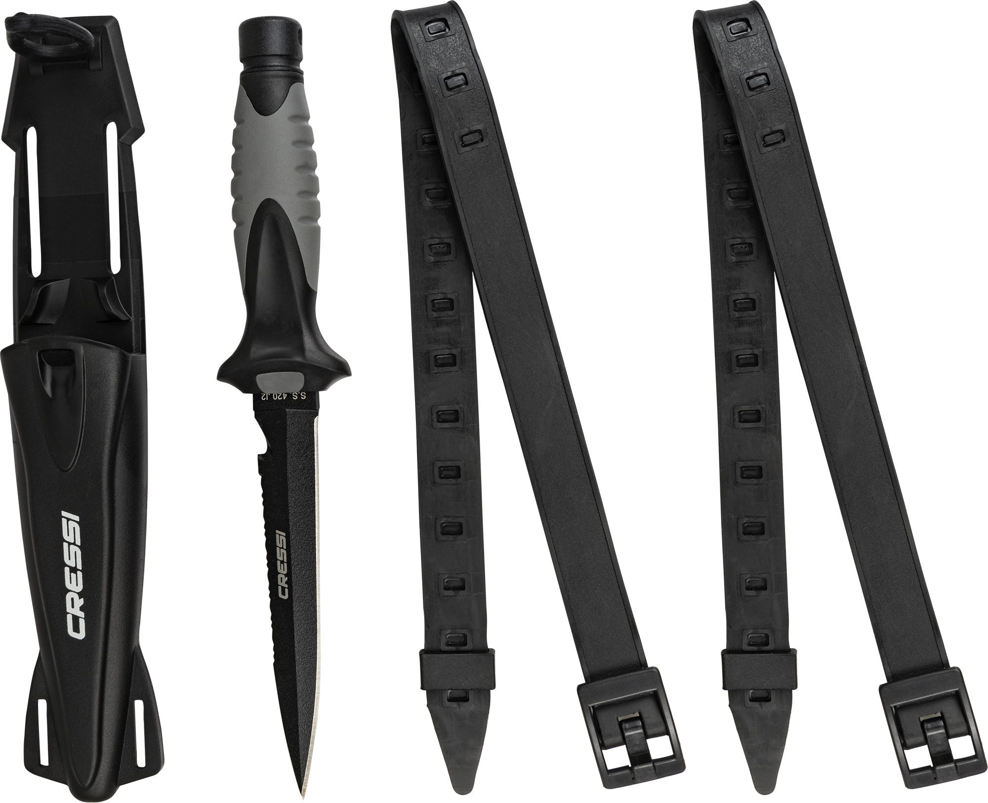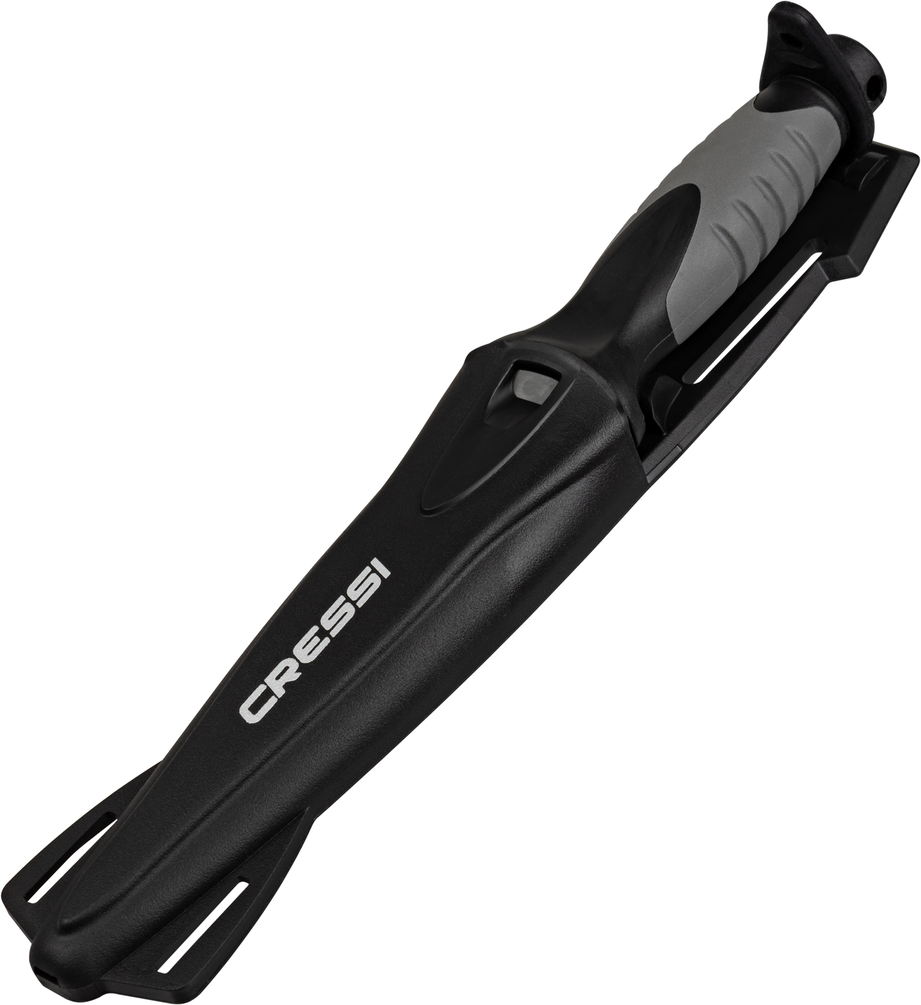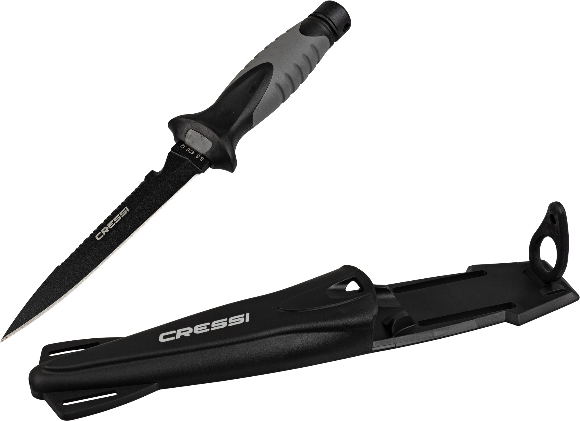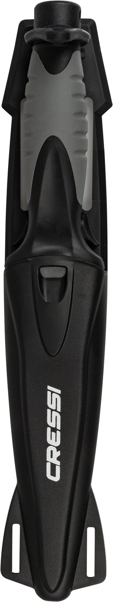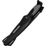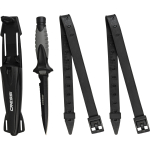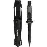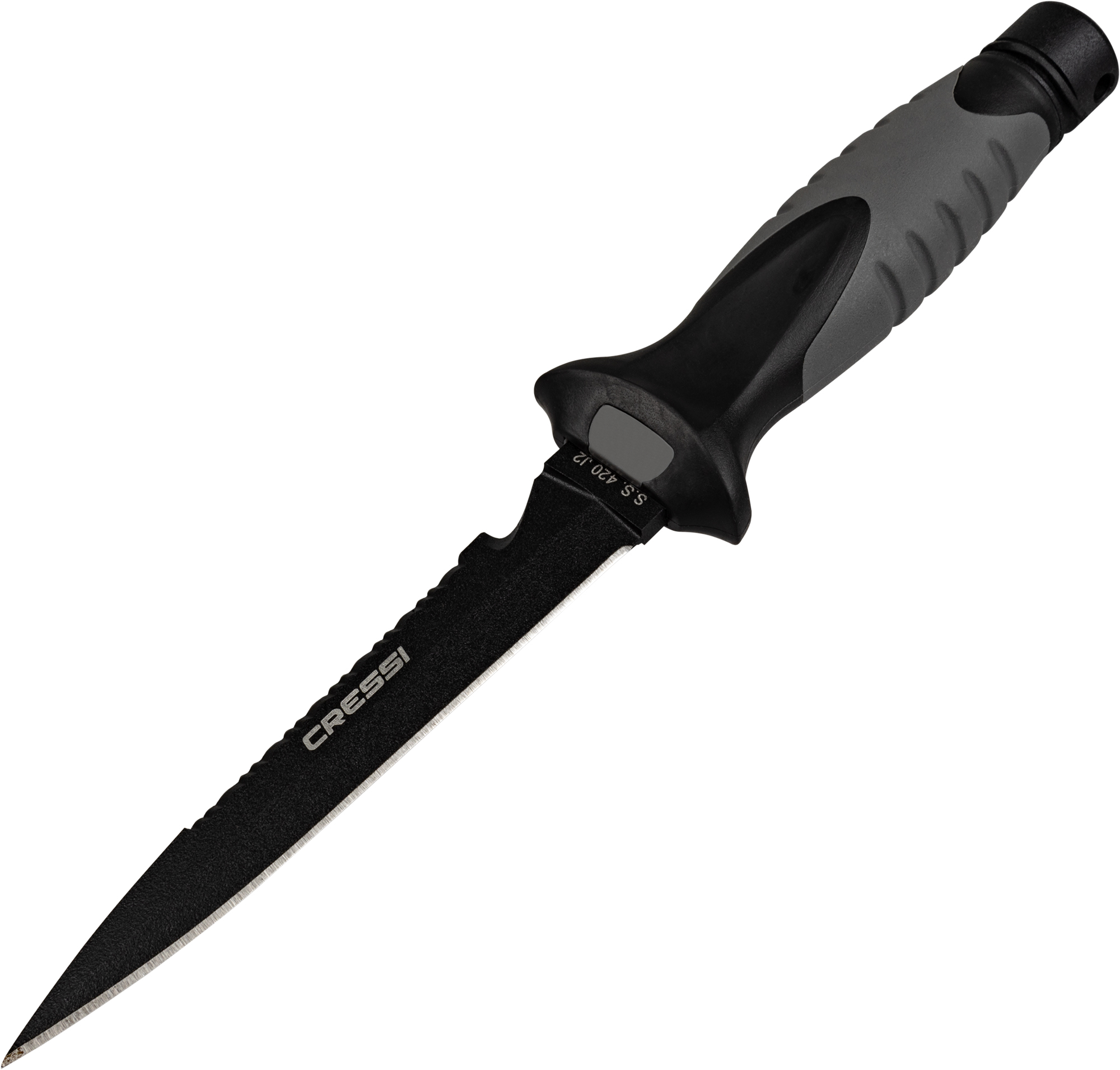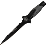 Medium-sized stiletto knife designed for underwater fishing. Manageable, high blade penetration and durability with a secure grip. The blade extends through the interior of the handle and, at the end of the handle, has a small pommel. Tempered aisi 304 steel with black coating. The duration of these features is guaranteed not by the sharpness itself, but by the quality of the material that guarantees the durability of the blade. Rhomboidal cross section for greater resistance to flexing and breaking. Double-edged blade with one smooth-edged side and the other serrated. Comfortable handle with rubbery polymer coating