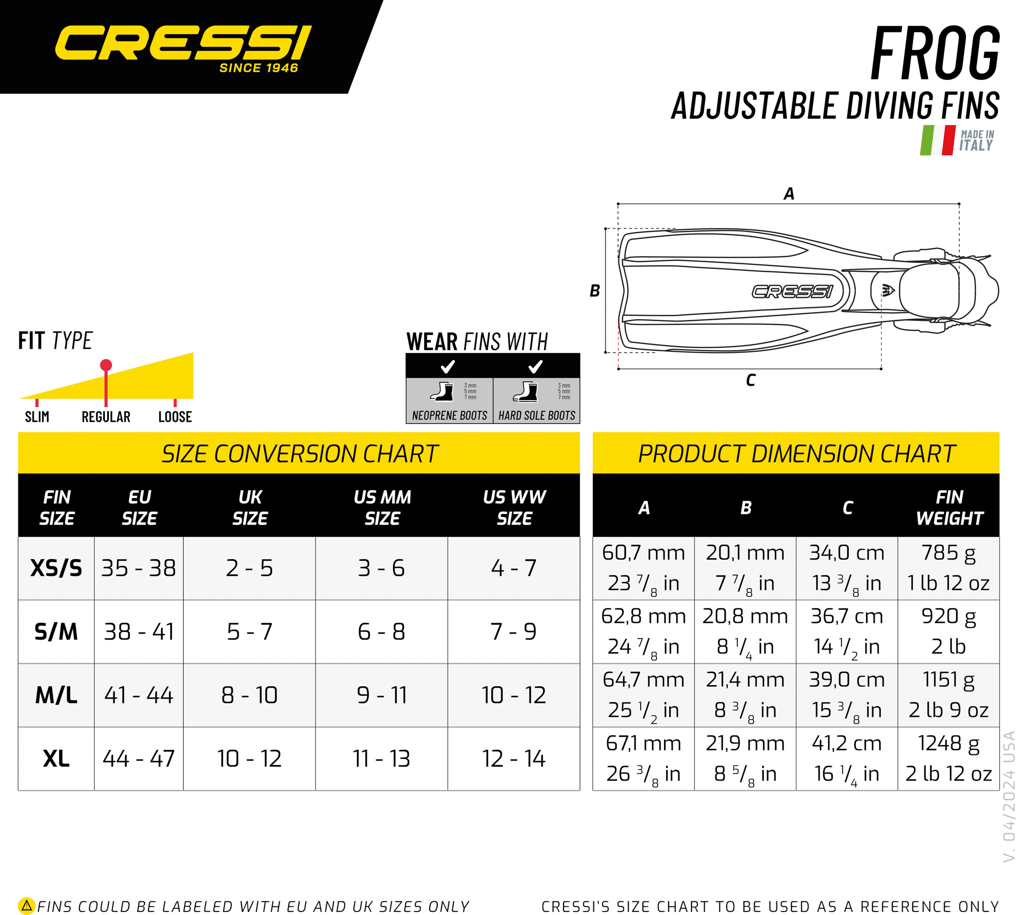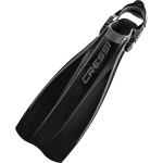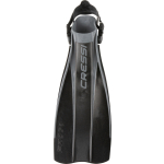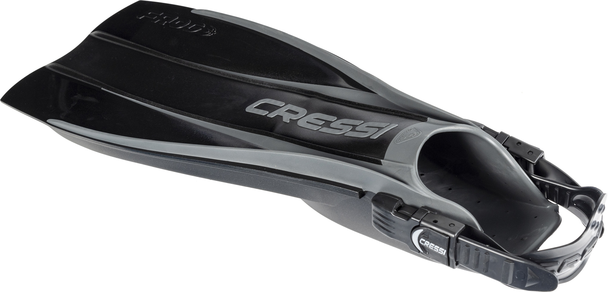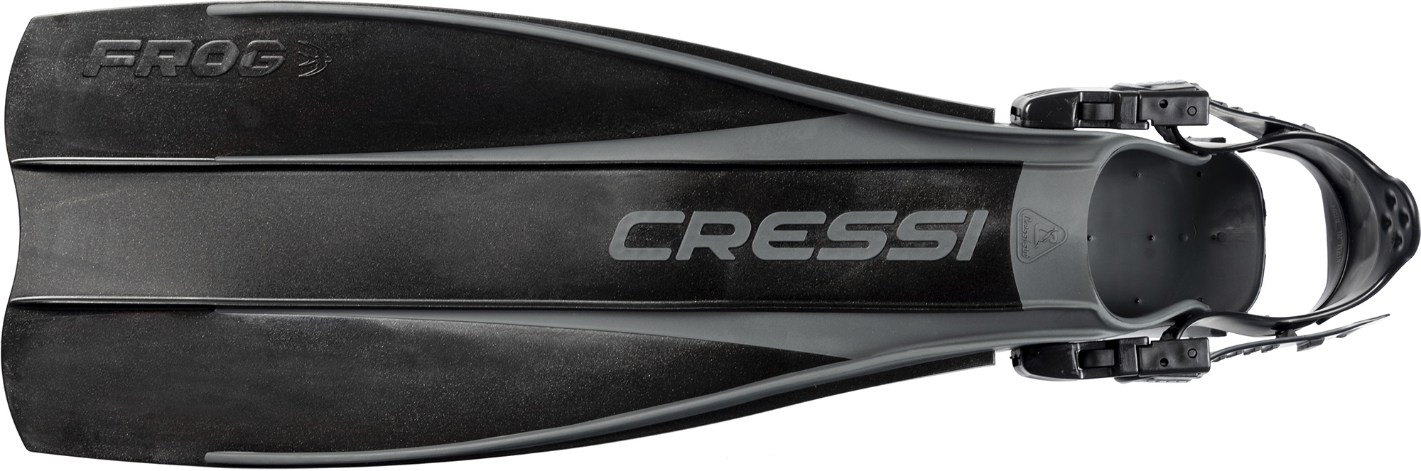 A classic in the cressi range, this has been on the market for many years and has a huge number of appreciators in every corner of the planet. The fin is made with a skilful combination of a strong copolymer and a soft elastomer, the latter used for the foot pocket, for the side stringers and for some inserts. The blade originates from the upper part of the foot pocket, with a 20% increase in useful surface area compared to a traditional fin of the same length. The foot pocket is computer designed and offers great comfort; it guarantees excellent transmission of the leg-fin thrust. The frog is heavier than the more recently designed equivalent cressi models. It is this feature that makes it agreeable to whoever uses very thick suits or watertight suits. Anyone who works underwater will appreciate this fin a great deal because it is strong and comfortable, very popular also in diving schools and excellent for rental