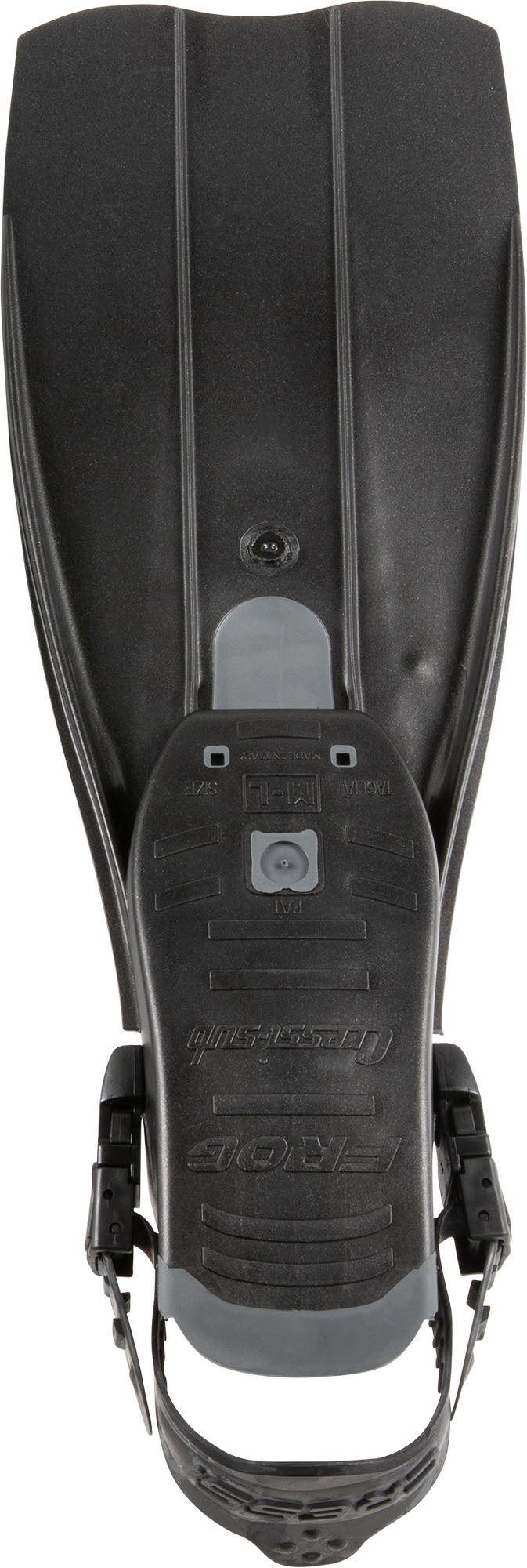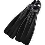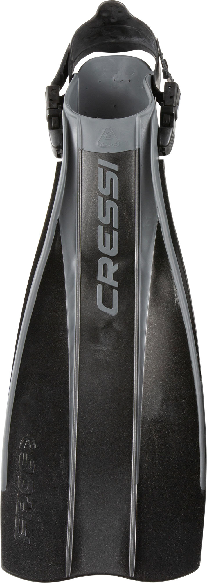 A classic in the cressi range, this has been on the market for many years and has a huge number of appreciators in every corner of the planet. The fin is made with a skilful combination of a strong copolymer and a soft elastomer, the latter used for the foot pocket, for the side stringers and for some inserts. The blade originates from the upper part of the foot pocket, with a 20% increase in useful surface area compared to a traditional fin of the same length. The foot pocket is computer designed and offers great comfort; it guarantees excellent transmission of the leg-fin thrust. The frog is heavier than the more recently designed equivalent cressi models. It is this feature that makes it agreeable to whoever uses very thick suits or watertight suits. Anyone who works underwater will appreciate this fin a great deal because it is strong and comfortable, very popular also in diving schools and excellent for rental