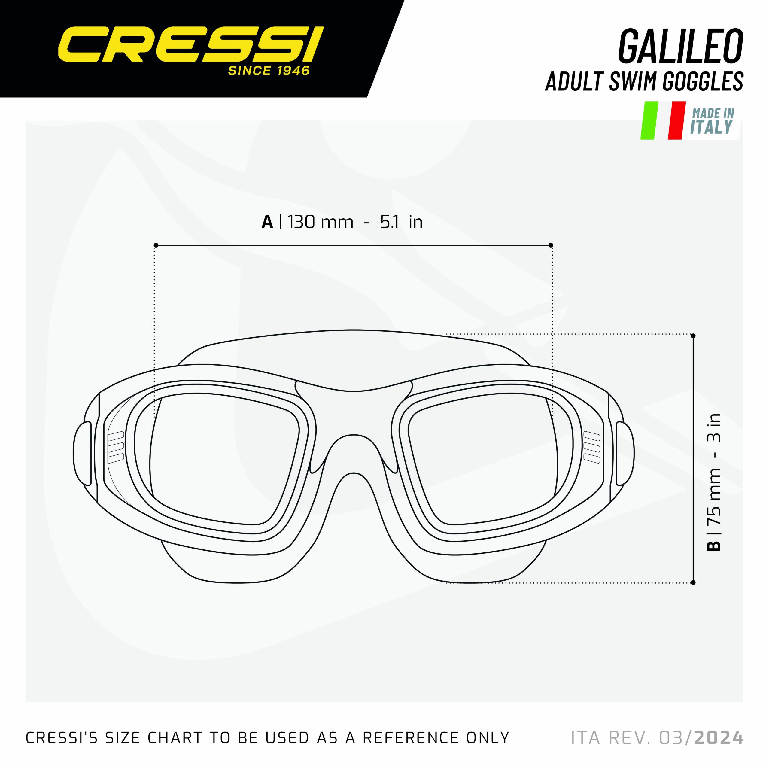 The galileo goggles have marked a historical turning point in the swimming goggles sector. In actual fact, their fl at lenses are mounted on a rigid frame, just like a diving masks, thus guaranteeing perfect vision with no distortion. The shape of the lenses, which are perfectly fl at and have no side curving, also prevents annoying distortion at the sides of the lenses. The watertight seal is extraordinary and comfort is excellent. The strap has a quick adjustment system (cressi patented), similar to that used on the prestigious cressi-sub masks, which allows quick and easy adjustment. The shatterproof lenses have external anti-scratch treatment, uv protection and internal anti-fog treatment