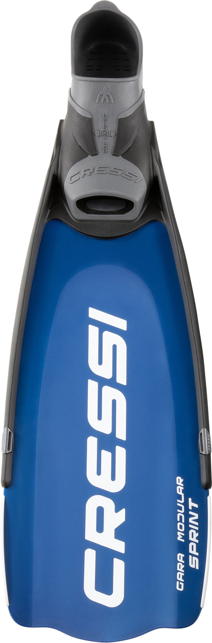 The new gara modular sprint fin is a shorter version of the impulse fin, which proved to be hugely popular with freedivers worldwide, both amateurs and the most demanding professional freedivers. This is also confirmed by the large number of articles dedicated to it by specialized journalists in sector magazines. Sprint is designed to meet the needs of freedivers and spearfishers who practice this sport in wintertime and when a fin as long as impulse is not necessary. Both fins have been designed using expensive finite element software programs that allow highly complex and equally high-performance sections to be defined. The blade of sprint, like the impulse blade, is made of a single thermoplastic elastomer, although it would be more correct to refer to an angled sublayer and an overlay. The sublayer follows the shape and dimensions of almost the entire fin. It has a uniform thickness and a flexible longitudinal propulsion wing of variable length. In contrast, the so-called overlay covers the propulsion wing selectively and has a thickness that slopes from the maximum value to zero longitudinally towards the tip of the blade. As a result, the fin offers a new way of storing and releasing elastic potential energy, greatly assisting movement of the freediver’s legs and thus guaranteeing a net improvement in propulsive output. When disassembled, the blade and foot pocket occupy the space of a normal snorkeling fin