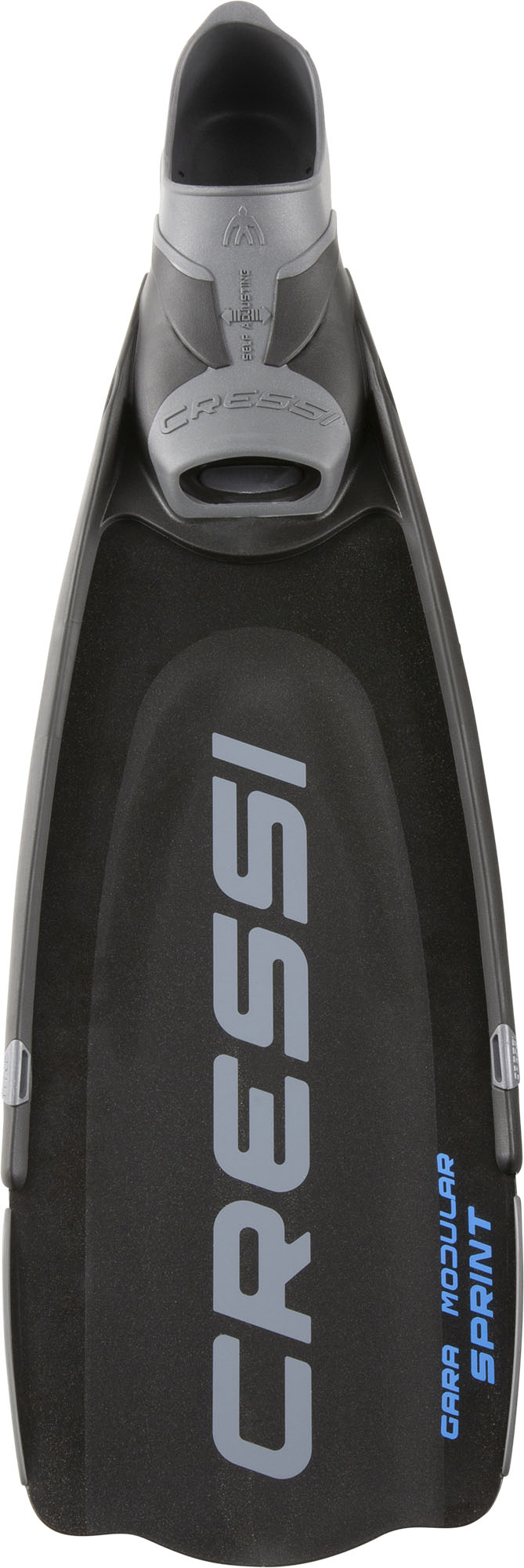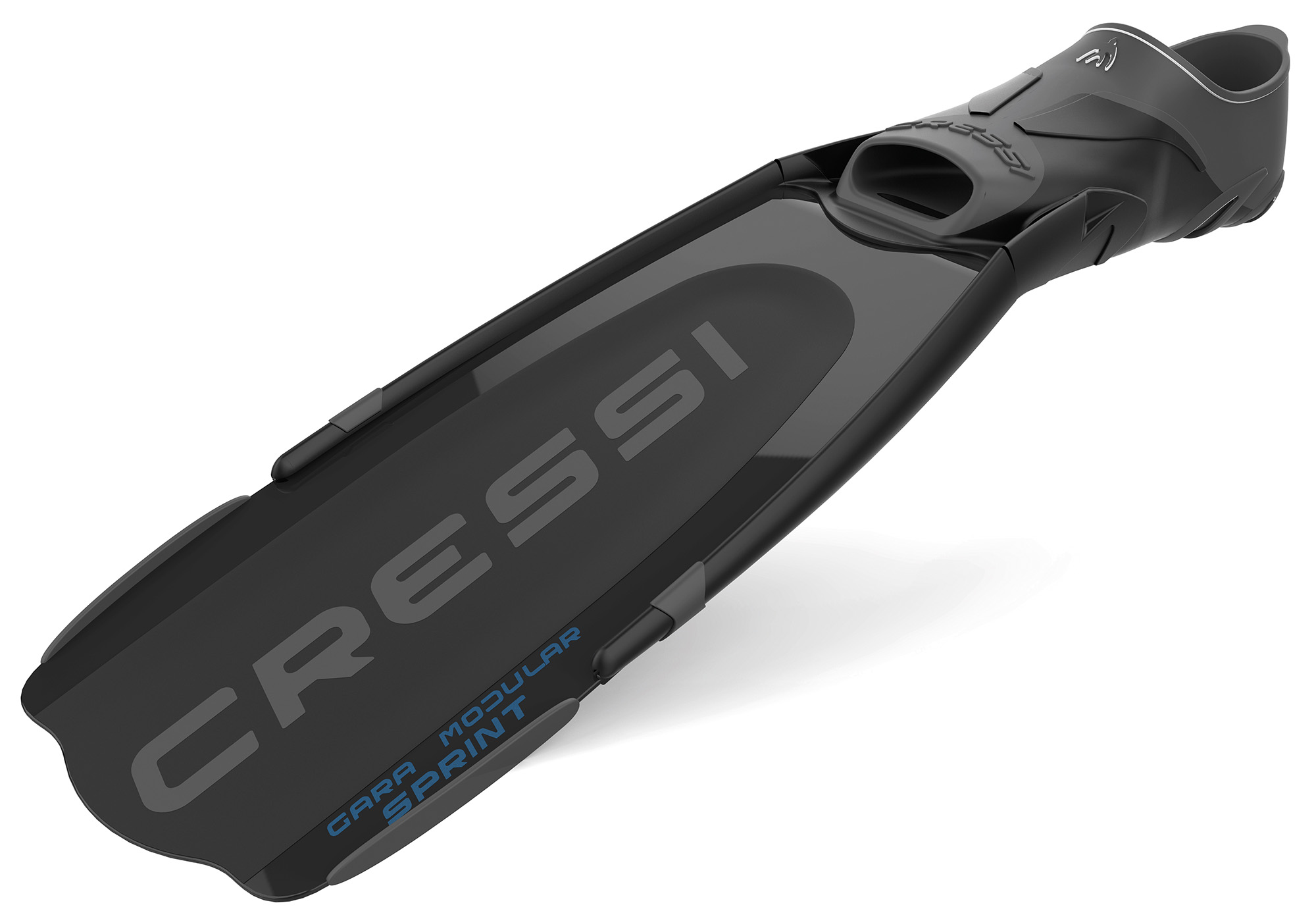 The new gara modular sprint fin is a shorter version of the impulse fin, which proved to be hugely popular with freedivers worldwide, both amateurs and the most demanding professional freedivers. This is also confirmed by the large number of articles dedicated to it by specialized journalists in sector magazines. Sprint is designed to meet the needs of freedivers and spearfishers who practice this sport in wintertime and when a fin as long as impulse is not necessary. Both fins have been designed using expensive finite element software programs that allow highly complex and equally high-performance sections to be defined. The blade of sprint, like the impulse blade, is made of a single thermoplastic elastomer, although it would be more correct to refer to an angled sublayer and an overlay. The sublayer follows the shape and dimensions of almost the entire fin. It has a uniform thickness and a flexible longitudinal propulsion wing of variable length. In contrast, the so-called overlay covers the propulsion wing selectively and has a thickness that slopes from the maximum value to zero longitudinally towards the tip of the blade. As a result, the fin offers a new way of storing and releasing elastic potential energy, greatly assisting movement of the freediver’s legs and thus guaranteeing a net improvement in propulsive output. When disassembled, the blade and foot pocket occupy the space of a normal snorkeling fin