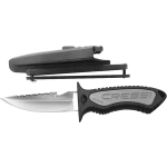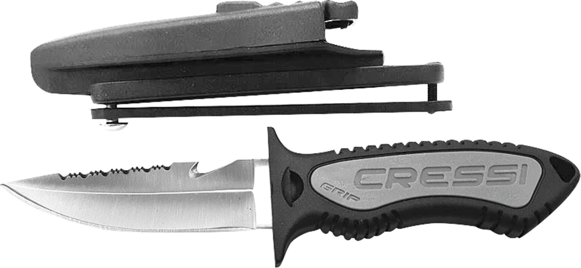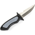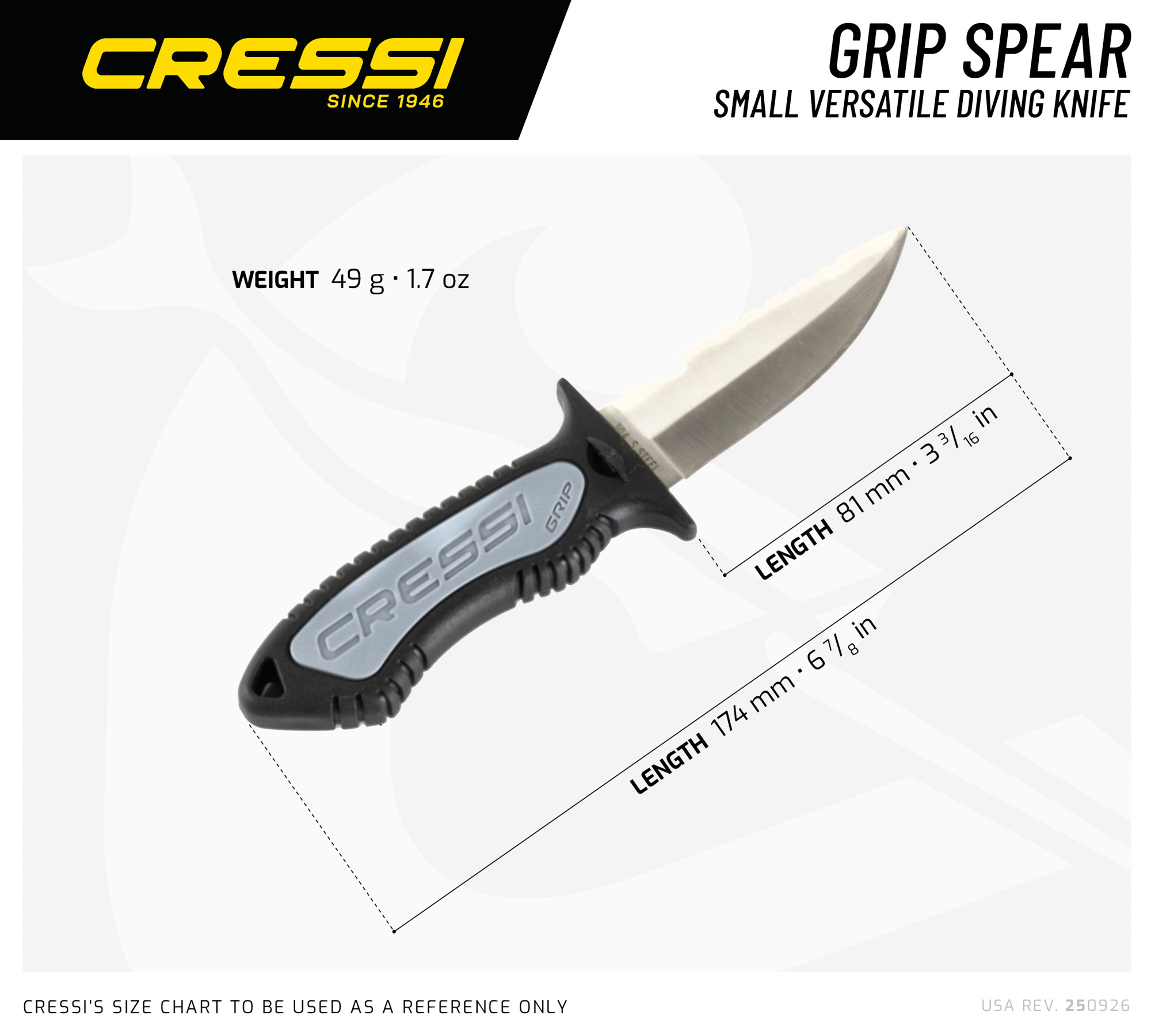 The grip spear is a small-sized knife with a tapered blade that makes it ideal for spearfishing. The blade is made in stainless steel. It features a high precision dagger point tip. One side is an extra rigid serrated blade for sawing, the other side is a skillfully crafted straight blade. It features an ergonomic non-slip handle grip and a hole to add a lanyard (not included). The knife comes with a sheath that can be attached to the bcd shoulder strap. The sheath has a locking mechanism that prevents the knife from falling out. With 2 rubber straps (included) you can fix the sheath to your leg or your arm. The straps are 20 in (50. 8 cm) long. Great for spear fishing or scuba diving; as primary knife or back-up
