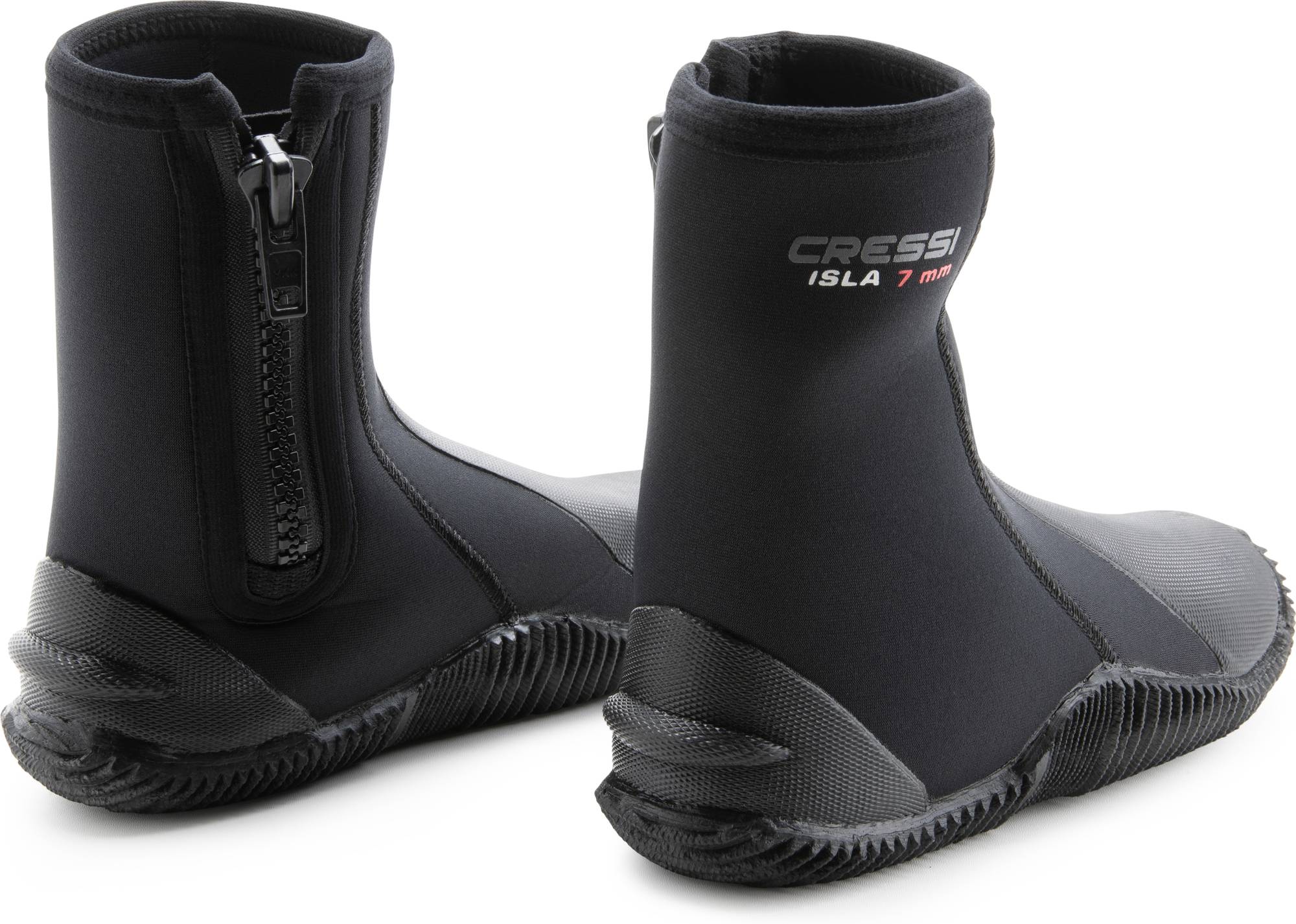 These boots are suitable for any kind of water sports to keep the feet warm. The back of the heel has a special design that fits perfectly with open heel fins for scuba diving. The small boss is used to prevents the slipping of the fins strap. Both the toe and the heel are reinforced with long-lasting rubber and provide protection against wear and tear. They are made from soft, double-lined neoprene and have a practical zip from the sole to the ankle, making them easy to slip on and off. Water seepage is reduced to the minimum thanks to a thin flap seal under the zip, which acts as an effective barrier against any water that may seep through the zip. A strong non-slip molding covers the entire sole. Available in 3,5 mm 5 mm and 7 mm neoprene thickness
