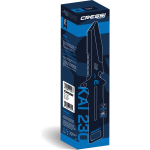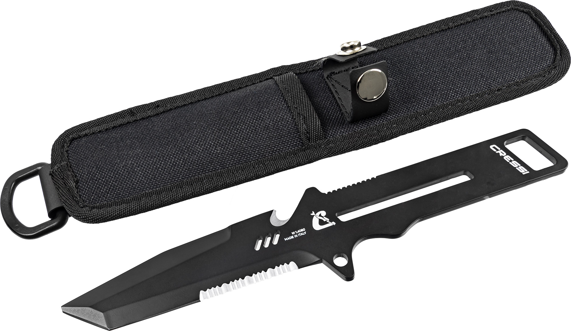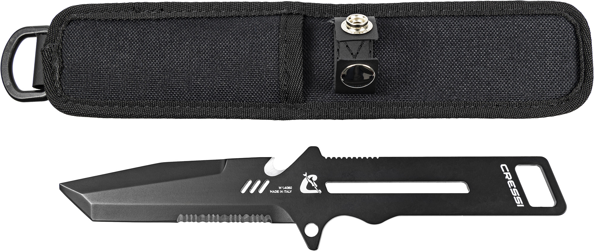 Italian-made professional diver’s knife, with blade and handle in w 1. 4060 martensitic stainless steel, hardness hrc 55/56, for an extremely sharp and honed blade. It has a v-shaped cross section blade and is equipped with a saw, a line cutter and a loop for the leash. The idroglider gold black surface treatment increases resistance to corrosion in marine environments. Equipped with a 1000 d ballistic nylon sheath and neoprene legbands and armbands in several sizes to perfect fits