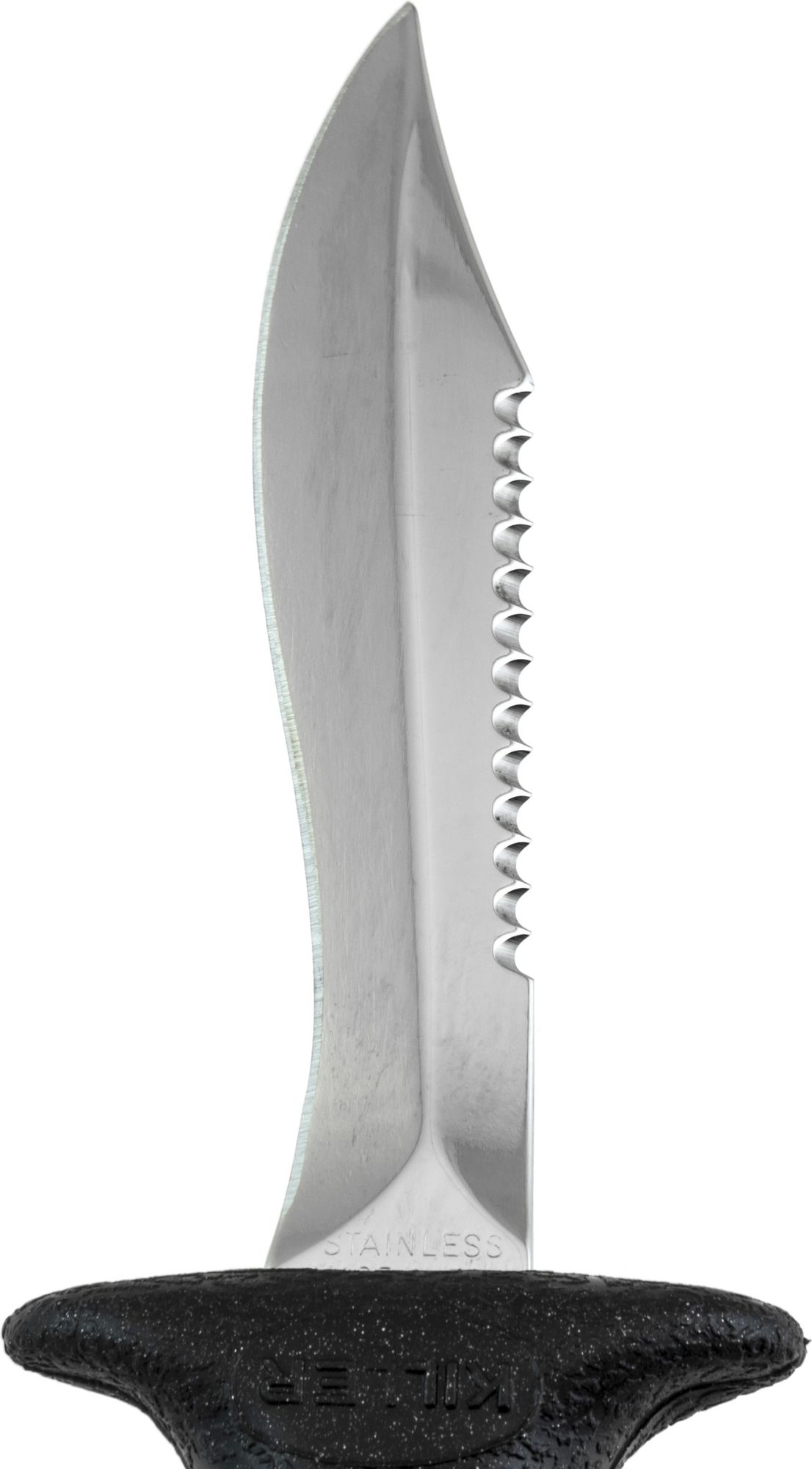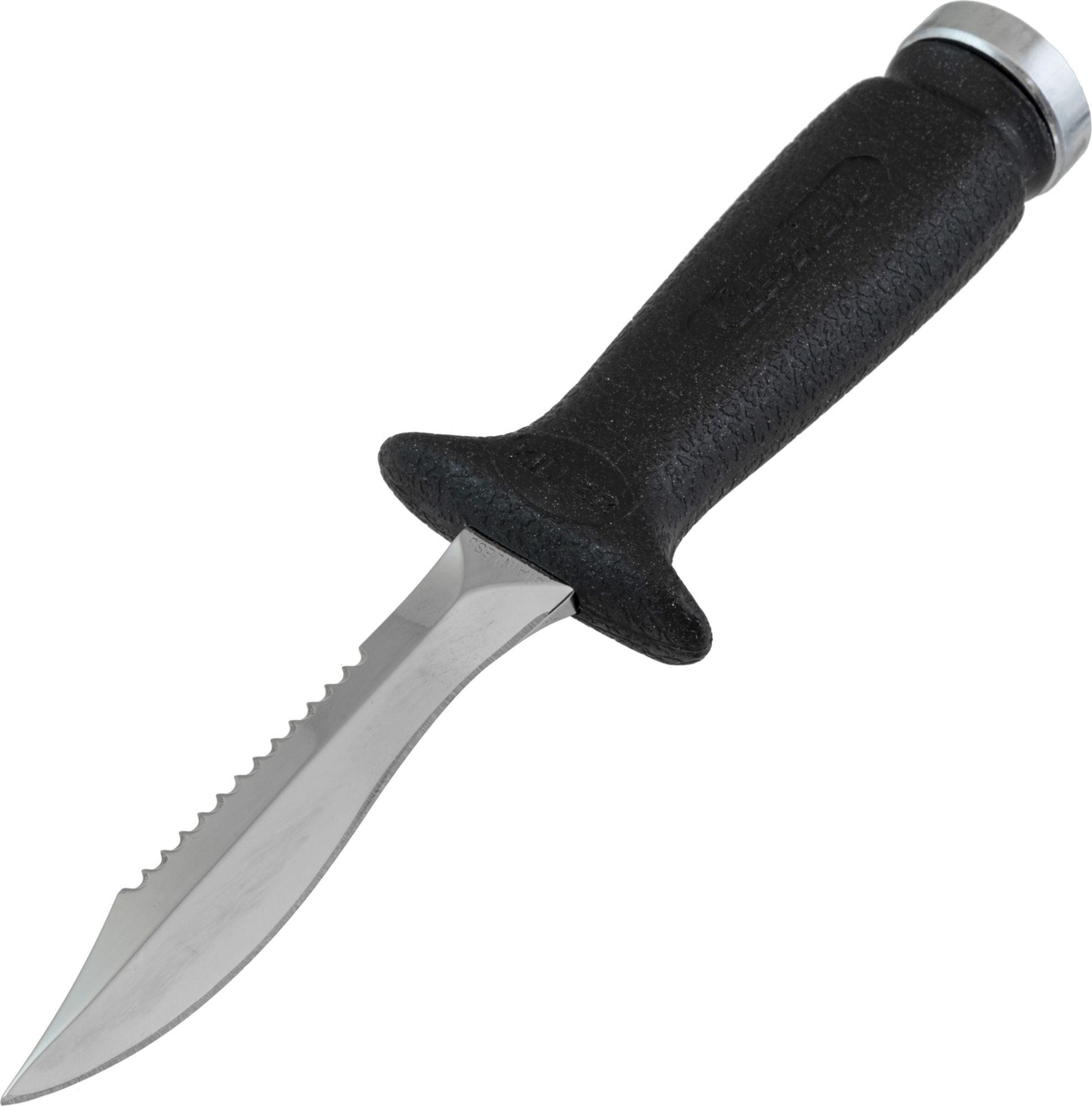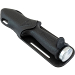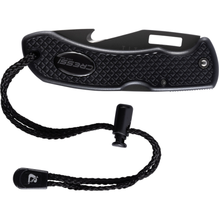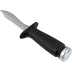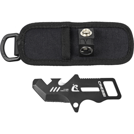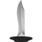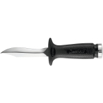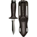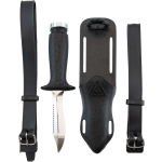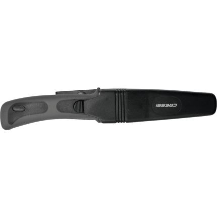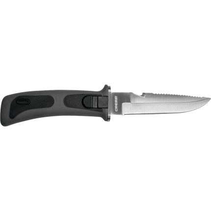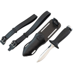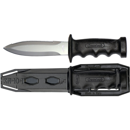 A small knife that´s been around for years now, highly appreciated because it is easy to handle and the blade penetrates really well. This is forged from a single piece of stainless steel, and is blocked at the grip by a screw knob situated at the end of the grip. One side of the blade has a smooth cutting edge, the other is partly serrated. The anatomical technopolymer grip ends at the blade with a thumb tab. The sheath is made from plastic and has a traditional elastic band to hold on the knife and loops to attach the knife to your leg or onto your belt. The knife comes with two, standard issue straps to attach it to your leg