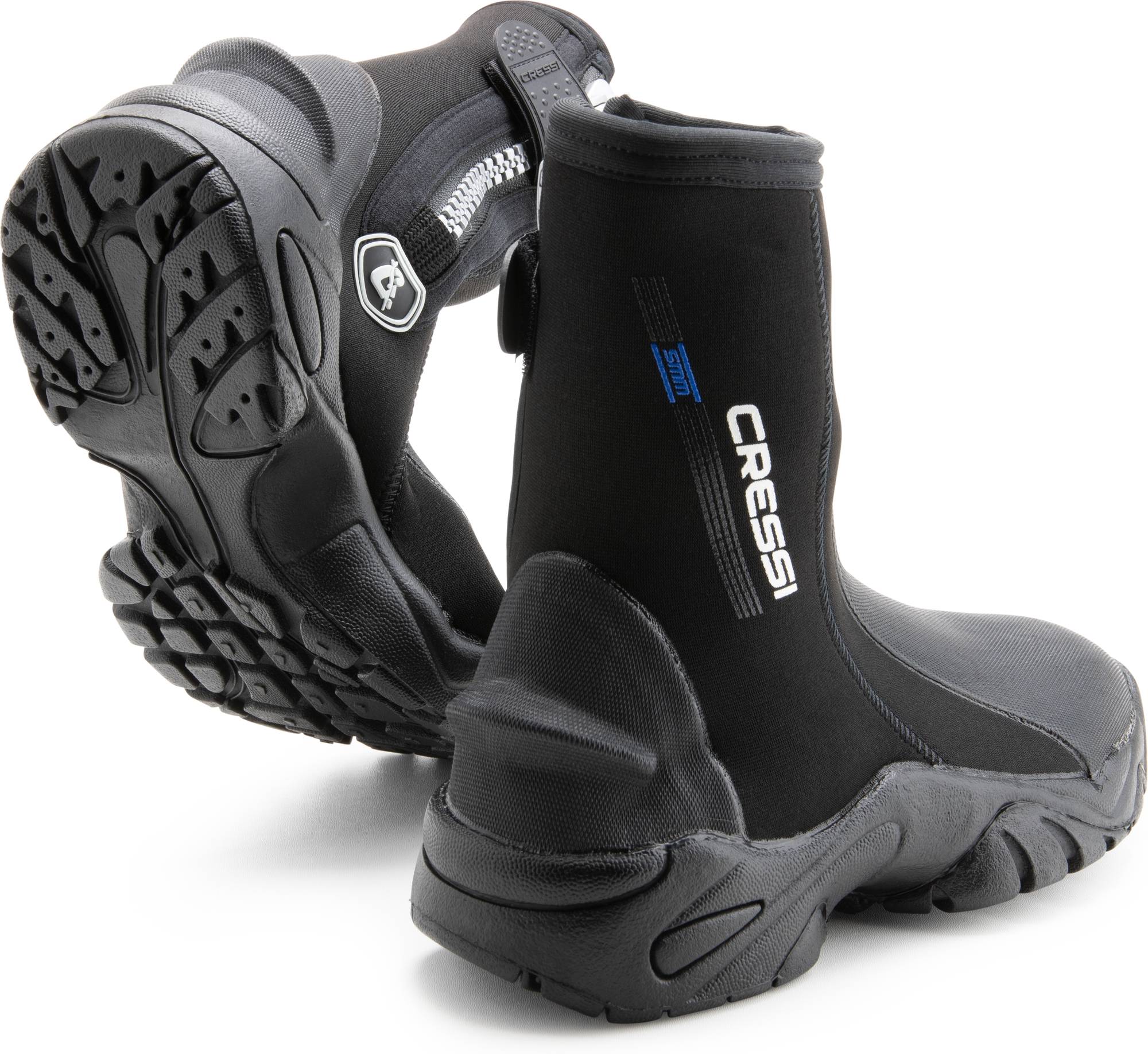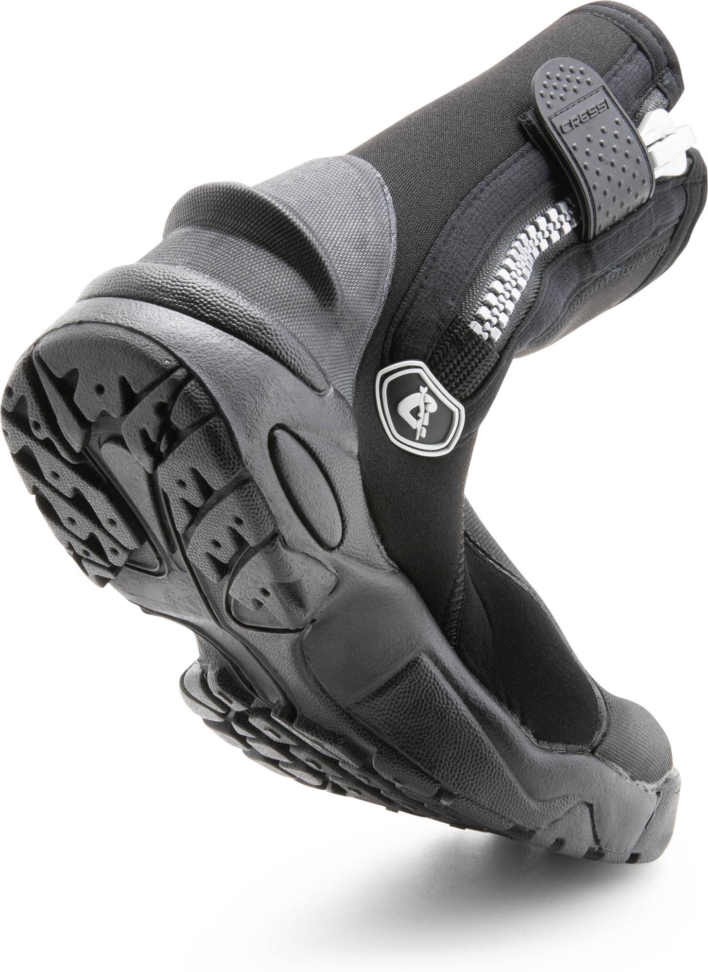 These boots, designed to be used with open heel fins, are made of soft nylon-lined neoprene 5 mm, ideal for cooler waters. Reinforced pu protection for instep and heel provides resistance against wear and tear. The notch for holding fin strap is integrated into the heel. A practical ykk zipper opens at the ankle for easy donning. Water seepage is reduced to the minimum thanks to a protective thin flap hydro seal under zip. The cressi personalized ankle strap has a velcro in the inner part. A rigid, non-slip and hi-grip moulding covers the entire sole