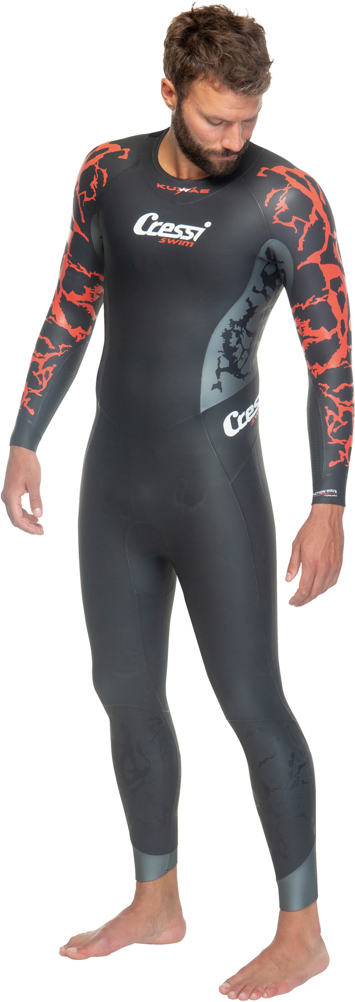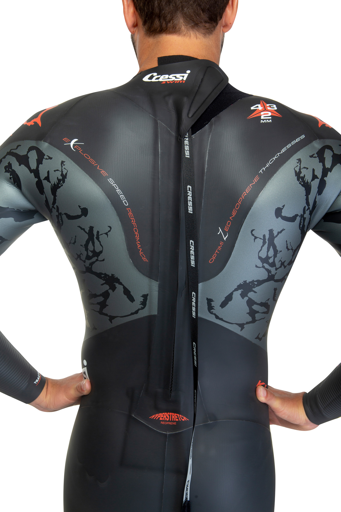 The new cressi swimming suit is inspired by the underwater caldera kuwae, located in the vanuatu archipelago in the south pacifi c ocean. The coral colour of the upper part of the wetsuit recalls the lava of the volcanic eruption, like the truly explosive design. This particular colour was also chosen to give the swimmer maximum visibility when in open water. Kuwae has been entirely designed with the help of sophisticated 3d software for the modelling of wetsuits, which made it possible to study the fi tting of the materials and the different sizes on virtual mannequins. In this way, cressi not only facilitates an innovative approach to research and development, but also obtains a positive environmental impact by eliminating unnecessary sample collections. The different thicknesses (2-3-4 mm) of the super-elastic materials favour buoyancy, help the swimmer to achieve a perfect trim when swimming on the surface and improve the fit in the arms/armpits, while ensuring complete freedom of movement. The striped material insert applied in the wrist area helps to move more water during the classic freestyle stroke. The new low neckline design has been studied to avoid any friction around the neck, while maintaining a perfect seal against water infi ltration. On the inner part of the under zip panel it is possible to customize the wetsuit with your name and insert the key of any means of transport in the special pocket. The ykk back zip guarantees tightness and resistance over time: the slider is made of anti-corrosion metal material, to ensure greater sturdiness when pulling the lanyard during the closing/opening of the wetsuit