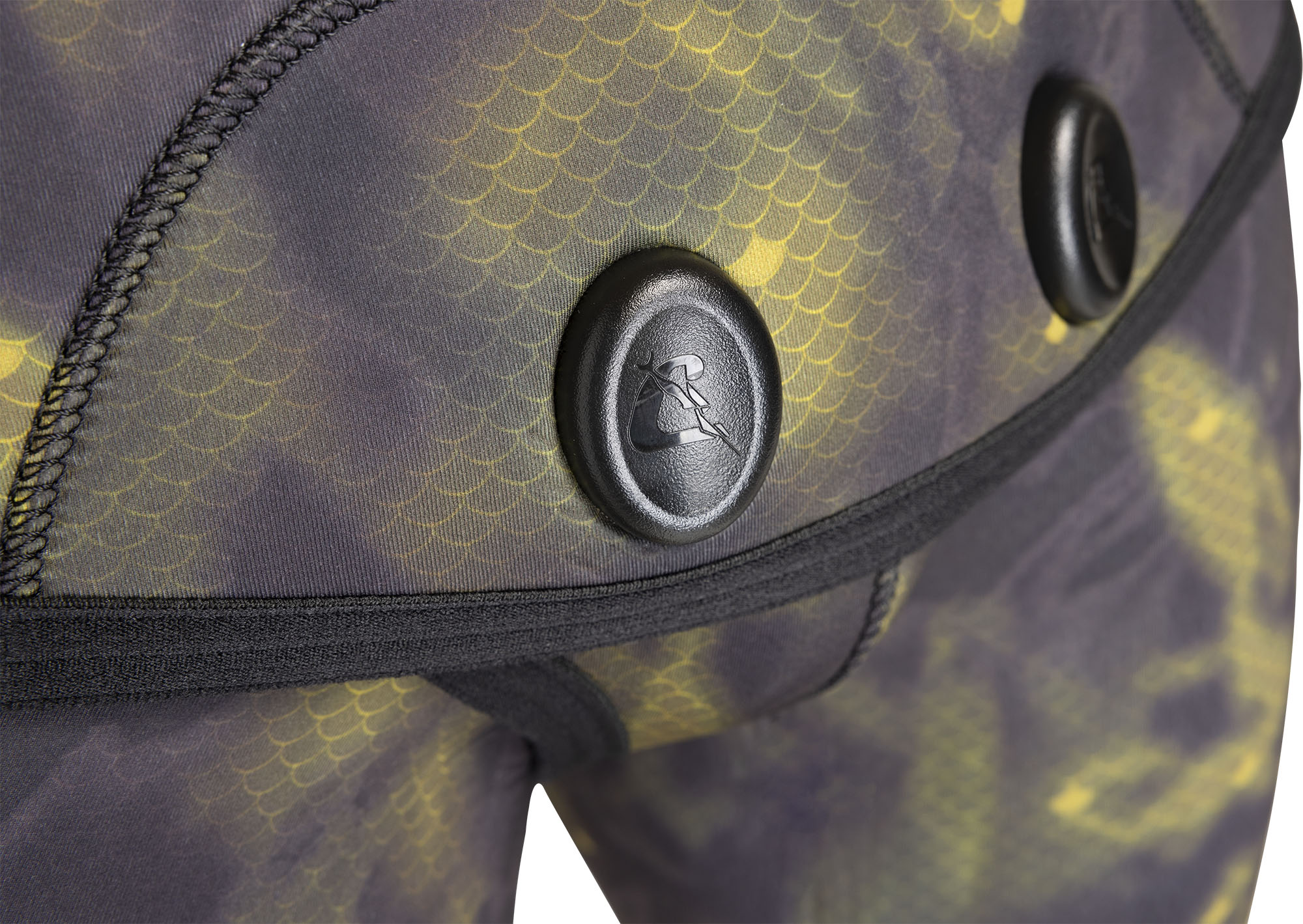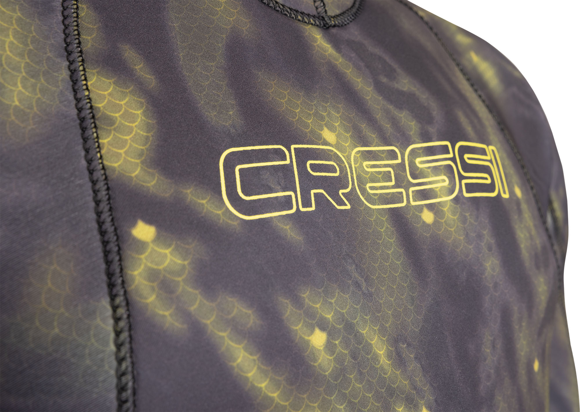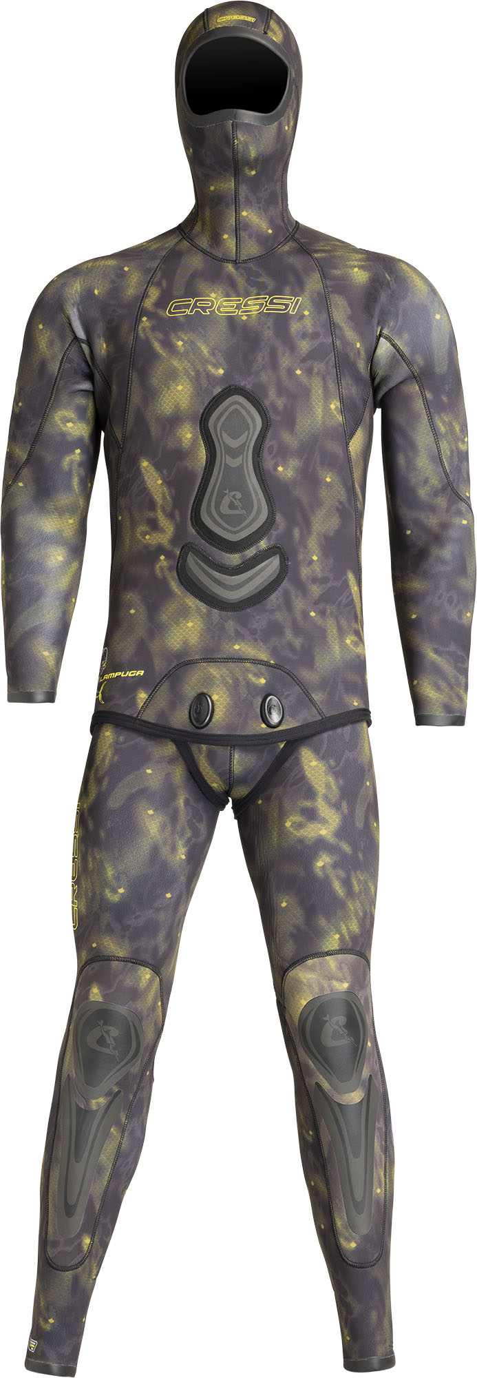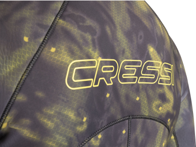 Inspired by the livery of the pelagic fish a special digital printing system has been used for this new camouflage wetsuit, allowing highresolution images to be obtained and thus create an exclusive camouflage design. The new “cryptic camouflage technology” of cressi is based on a real image of a fish (a dolphin fish in this case, with its dominant colours), to create camouflage that is very close to the original and then altered to obtain a repetitive effect that is one of a kind. The wetsuit is manufactured in two separate 5 or 7 mm pieces (jacket and pants). The materials used are: highlyelastic camo on the outside, open-cell neoprene on the inside