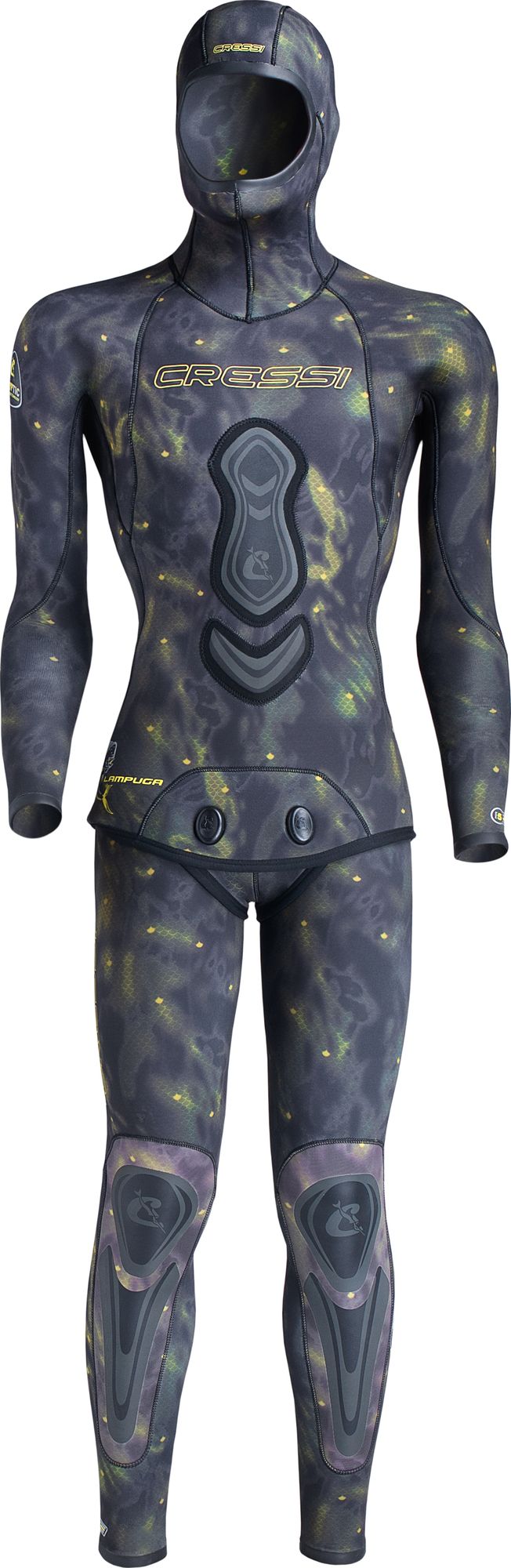 Inspired by the livery of the pelagic fish a special digital printing system has been used for this new camouflage wetsuit, allowing highresolution images to be obtained and thus create an exclusive camouflage design. The new “cryptic camouflage technology” of cressi is based on a real image of a fish (a dolphin fish in this case, with its dominant colours), to create camouflage that is very close to the original and then altered to obtain a repetitive effect that is one of a kind. The wetsuit is manufactured in two separate 5 or 7 mm pieces (jacket and pants). The materials used are: highlyelastic camo on the outside, open-cell neoprene on the inside