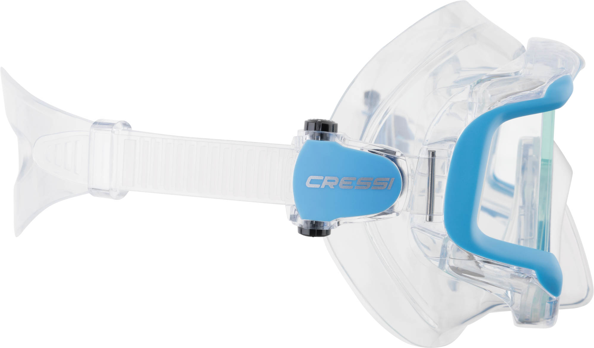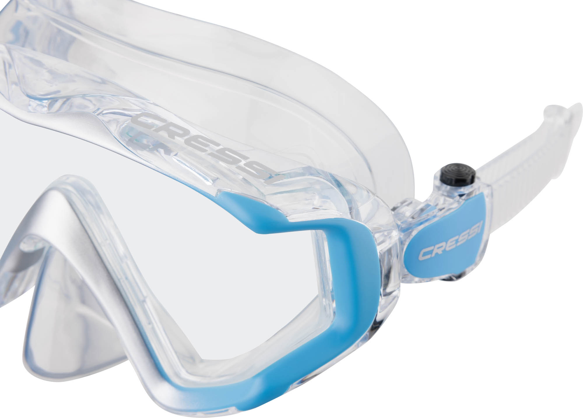 The liberty triside features a wide mono front lens with 2-sided lenses to ensure a panoramic view without interruption. The result is a mask that allows maximum light and feels as open as the ocean itself. All lenses are tempered glass for the best clarity. The skirt is made in hypoallergenic silicone to ensure comfort and a perfect seal. It is a breeze to adjust the length of the strap thanks to the two buttons on the buckle, which can also be used while wearing gloves. The frame is colored with a paint effect that makes the mask elegant and beautiful to see, which can be coordinated with your equipment