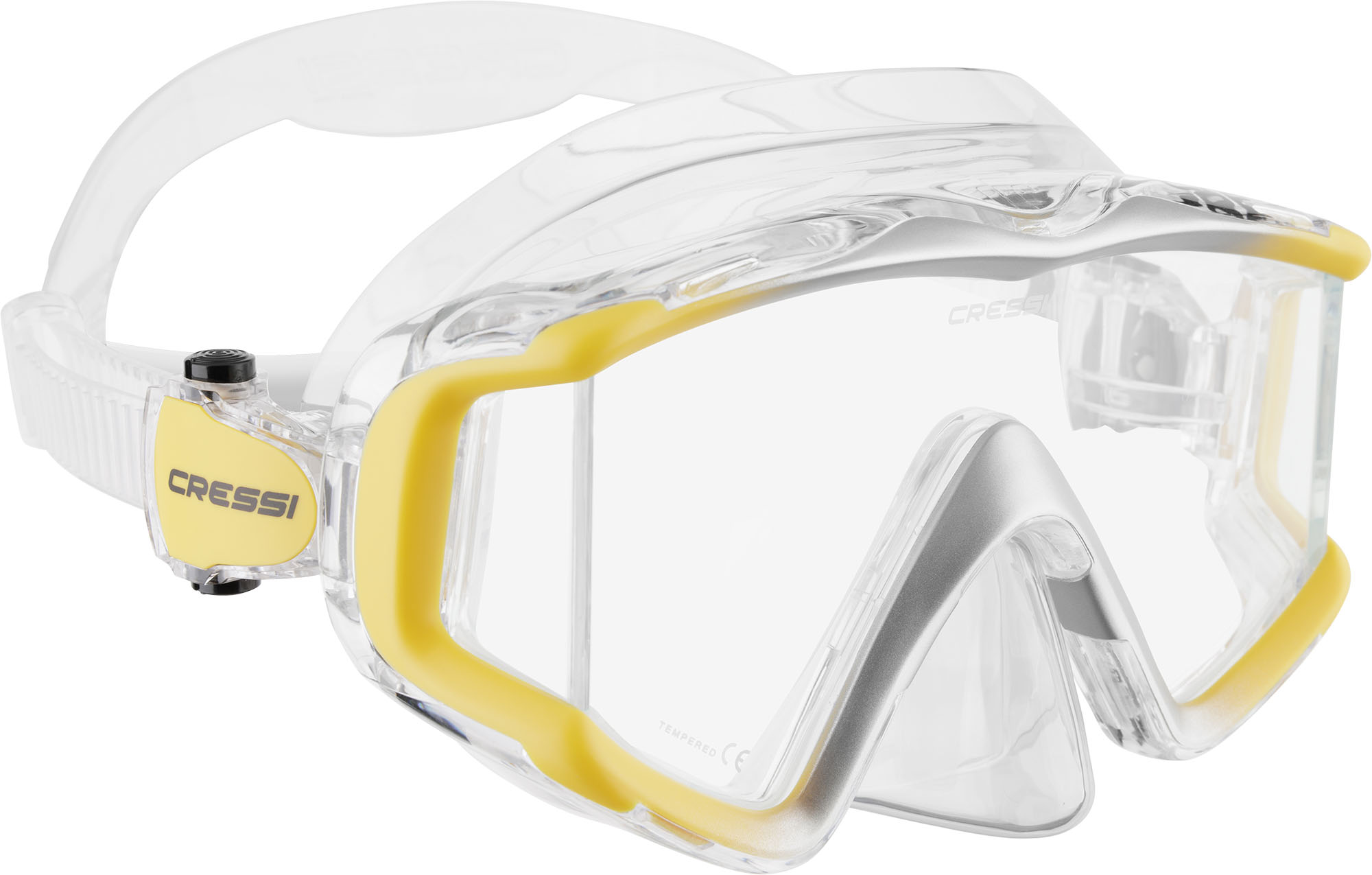 The liberty triside features a wide mono front lens with 2-sided lenses to ensure a panoramic view without interruption. The result is a mask that allows maximum light and feels as open as the ocean itself. All lenses are tempered glass for the best clarity. The skirt is made in hypoallergenic silicone to ensure comfort and a perfect seal. It is a breeze to adjust the length of the strap thanks to the two buttons on the buckle, which can also be used while wearing gloves. The frame is colored with a paint effect that makes the mask elegant and beautiful to see, which can be coordinated with your equipment
