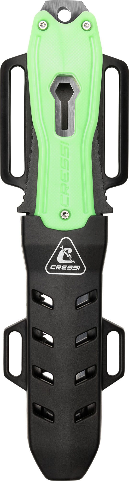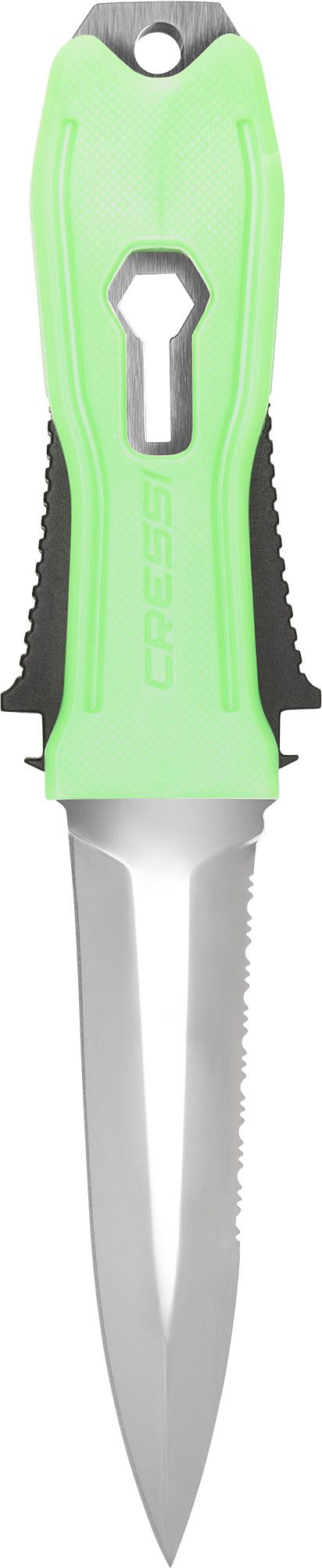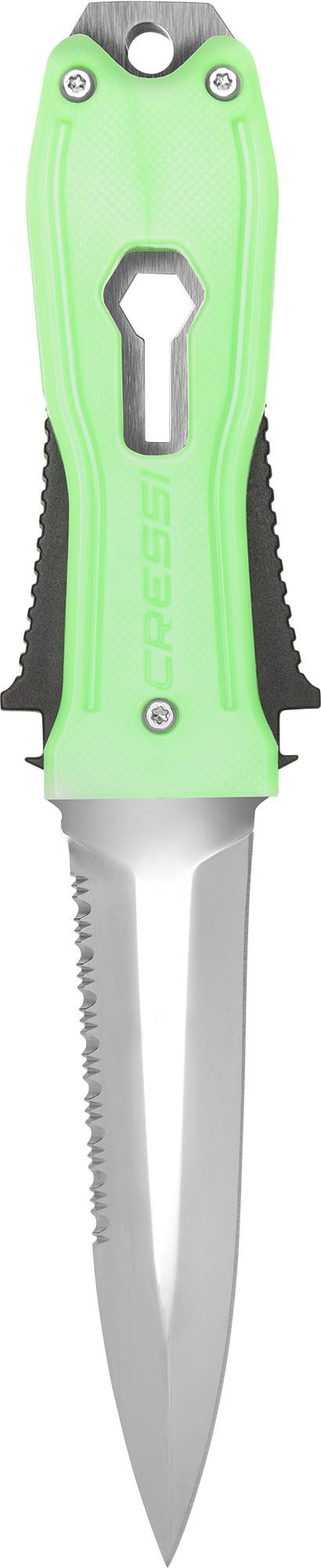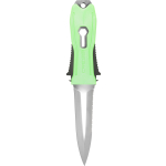Italian-made professional, multipurpose diver’s knife, with blade and handle in w 1.4116 martensitic stainless steel, hardness HRC 55/56, for an extremely sharp and honed blade. The 1.4116 steel is a stainless steel known for its high corrosion resistance, strength, and good mechanical properties. A knife with a dagger handle designed specifically for fishing. In the body of the knife, a part is intended for the extraction of stranded shafts and for straightening them. The knife can be removed from its sheath quickly and with one hand thanks to a special mechanical system.
