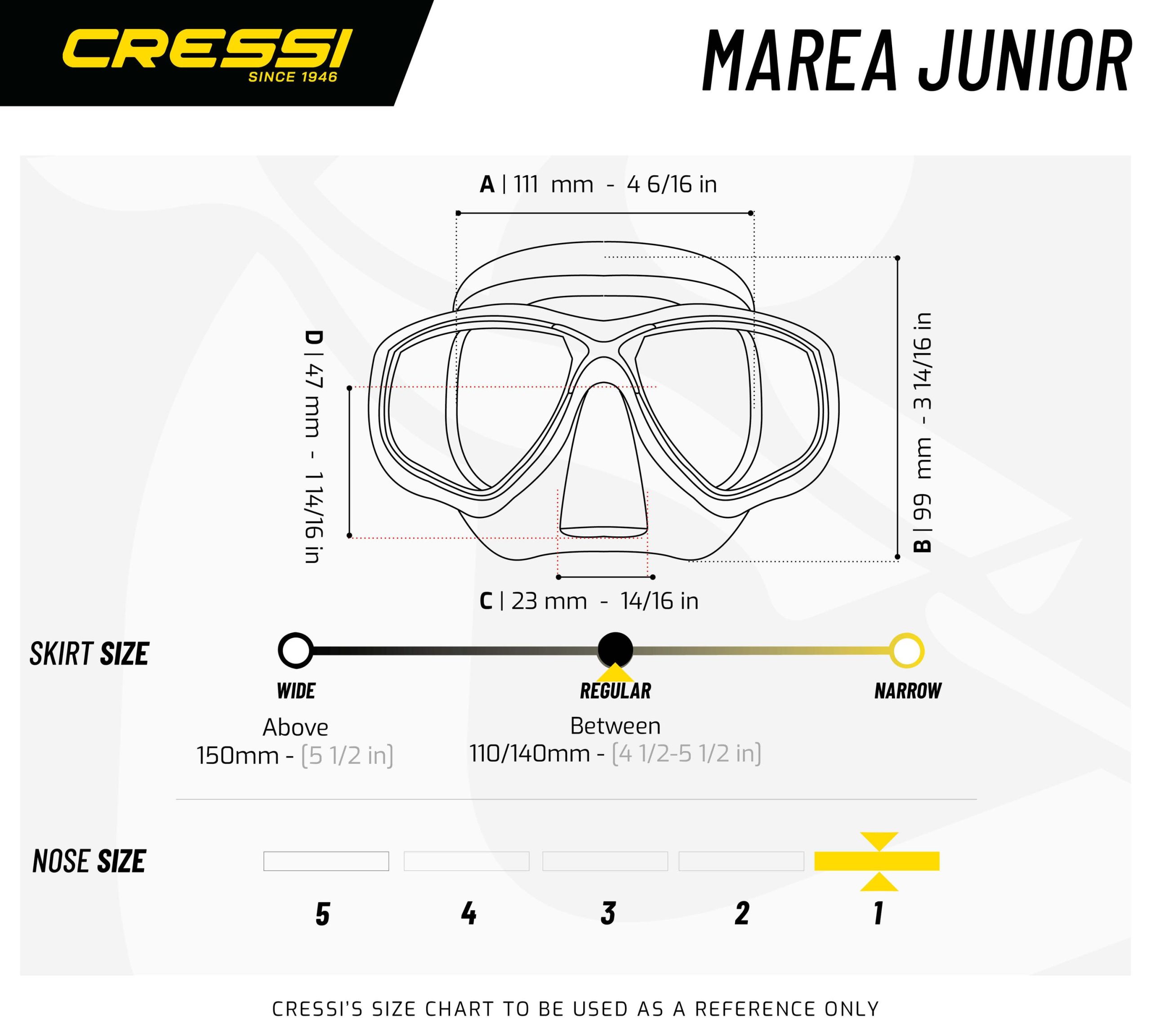 The Marea Junior is a 2 lens Mask that is particularly suitable for scuba diving and snorkeling. It has dual tempered glass lenses, a double feathered skirt edge that adapts to most faces and a small inner volume that is perfect when going deep underwater. The Marea Junior is made from 100% clear high-quality sealing soft silicone rubber that offers extraordinary and unprecedented comfort and fit. Designed for younger and women divers the Marea Junior Mask gives an exceptionally wide field of view. Mask is equipped with Cressi’s micrometric easy adjust buckles and has a wide silicone rubber split strap designed mask strap for even dispersion of pressure for increased fit and comfort. Mask has an easy-to-reach one-hand nose pocket for ear equalization.