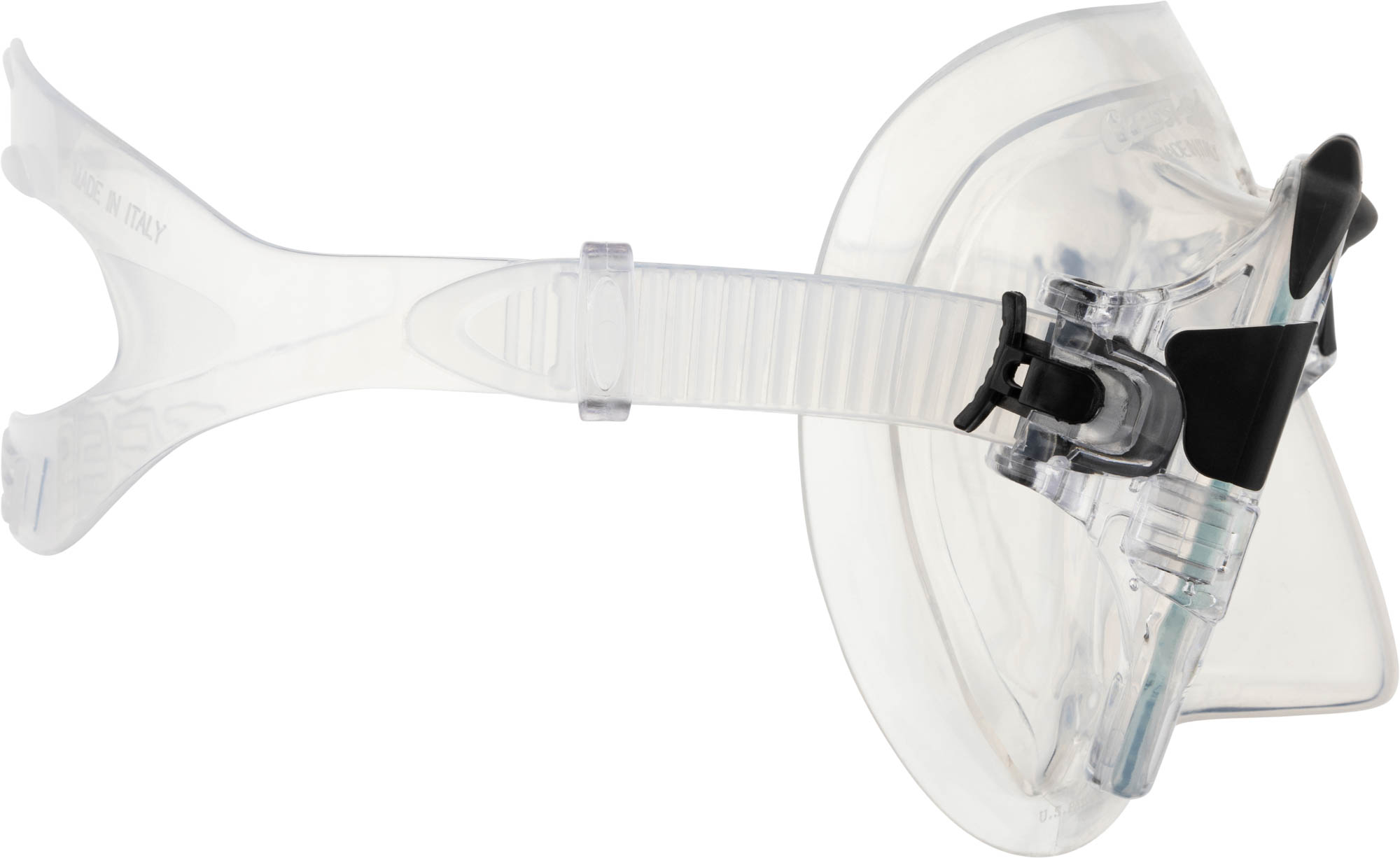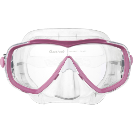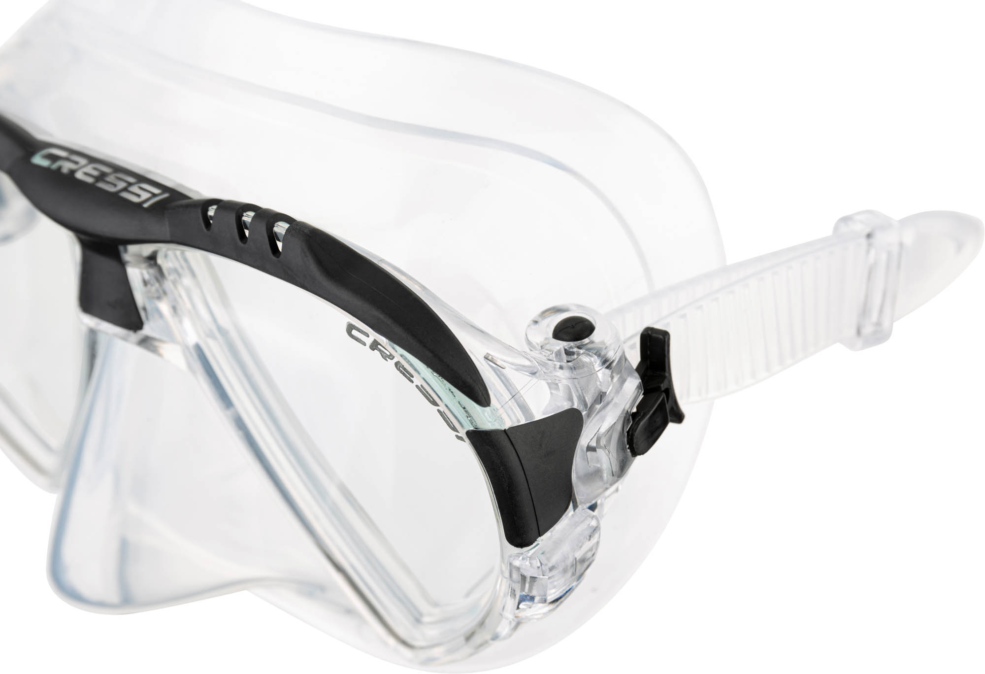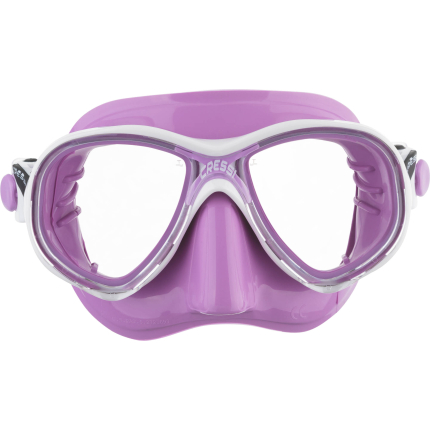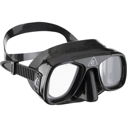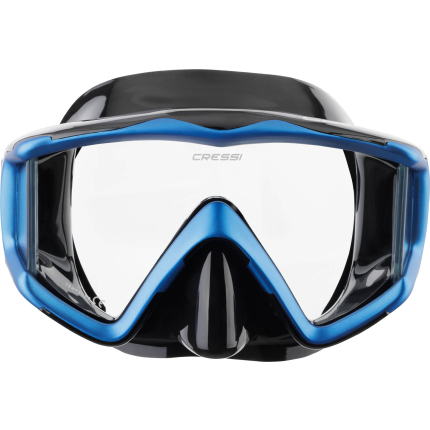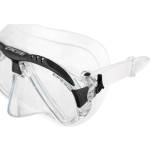 Following the revolutionary principles introduced by big eyes, the matrix establishes new records. The cressi patented raked lenses and their special “inverted drop” shape has been developed even further. The lenses are now as close as possible to the eyes, taken to the maximum levels possible. The newly designed frame is very streamlined and ends up being completely invisible when the mask is worn. The top part of the mask has strong grip rubber material inserts, for a great look. The soft silicone skirt has a new profile and a broad seal ring for excellent waterproofing and comfort without precedent. The internal volume of the mask is exceptionally low, lower than many well-known freediving mask and the weight is also very moderate. Two pressure buckles integrated into the frame make strap adjustment quick and precise. This new design strap has a very broad purchase on the neck for magnificent comfort. Excellent mask for snorkelling, scuba diving and skin diving