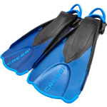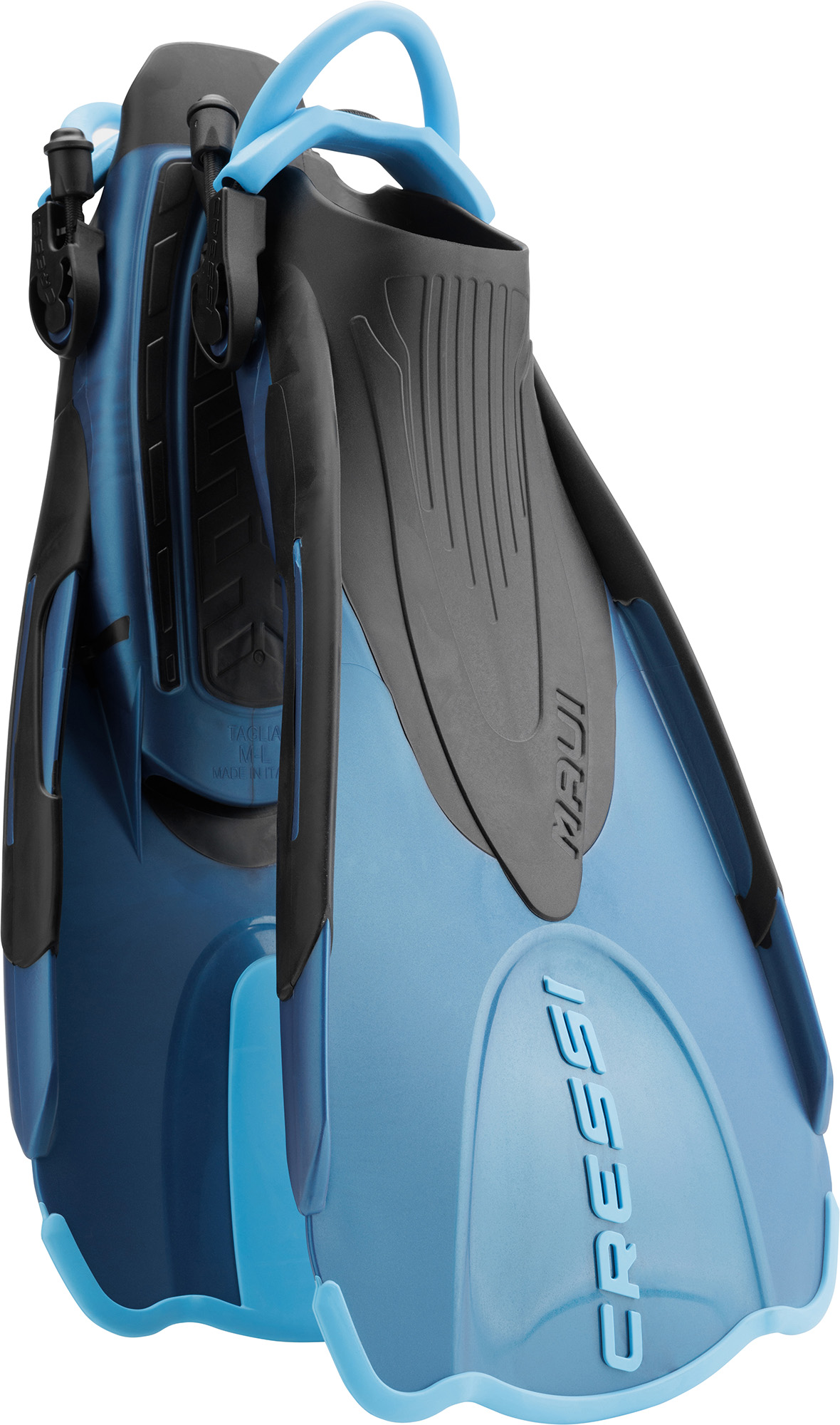 Maui short is a short fin, ideal for swimming in open and confined waters, and for snorkeling. For its robustness and practicality, is the ideal fin for safety and rescue teams operating on beaches. Maui short has been developed using the same calculation programs that we used to design on impulse and sprint fins, and on her “big sister” maui. Two side rails, built in two different materials, convoy the water towards the central part of the blade. The combination of a softer material and a stiffer one makes this fin extremely soft and extremely performing at the same time. When the blade flexes it creates a “spoon” effect and bouncing back in position it emits a great propelling power in return. The strap is built using an ebs system made of elastic rubbers, with a nylon lining, that guarantees a very long duration and resistance to abrasion. The heel is made of soft rubber, cut in an anatomic shape. This fin can be used with or without neoprene socks. The handle is wrapped around the heel, so that it does not interfere with the movement of legs and feet when swimming. The ebs system is very stable on its own, but we added a choker un the elastic bands to allow a fine tuning of the fin and to avoid an unwanted release. Maui short is a fin for swimming in the sea or in the swimming-pool, it can be used for snorkeling and it’s the fin of choice for rescue teams operating on beaches