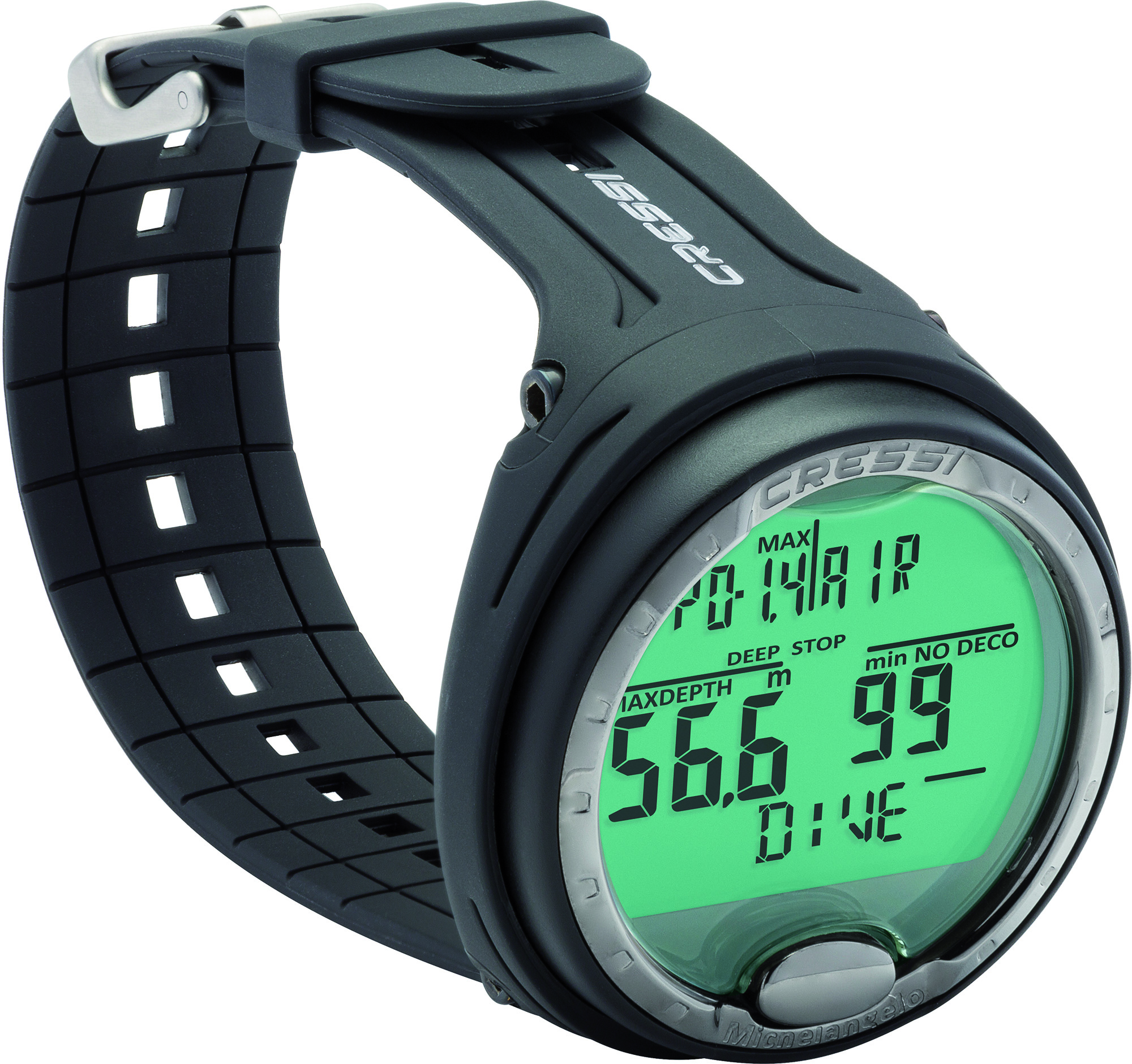 You can manage two different Nitrox gas mixes during your dive and safely switch between air and Nitrox modes during desaturation thanks to the advanced Cressi RGBM Algorithm. Additionally, the Michaelangelo’s Central Nervous System toxicity display provides real-time insights into your exposure to oxygen, helping avoid the risk of O2 toxicity during the dive.