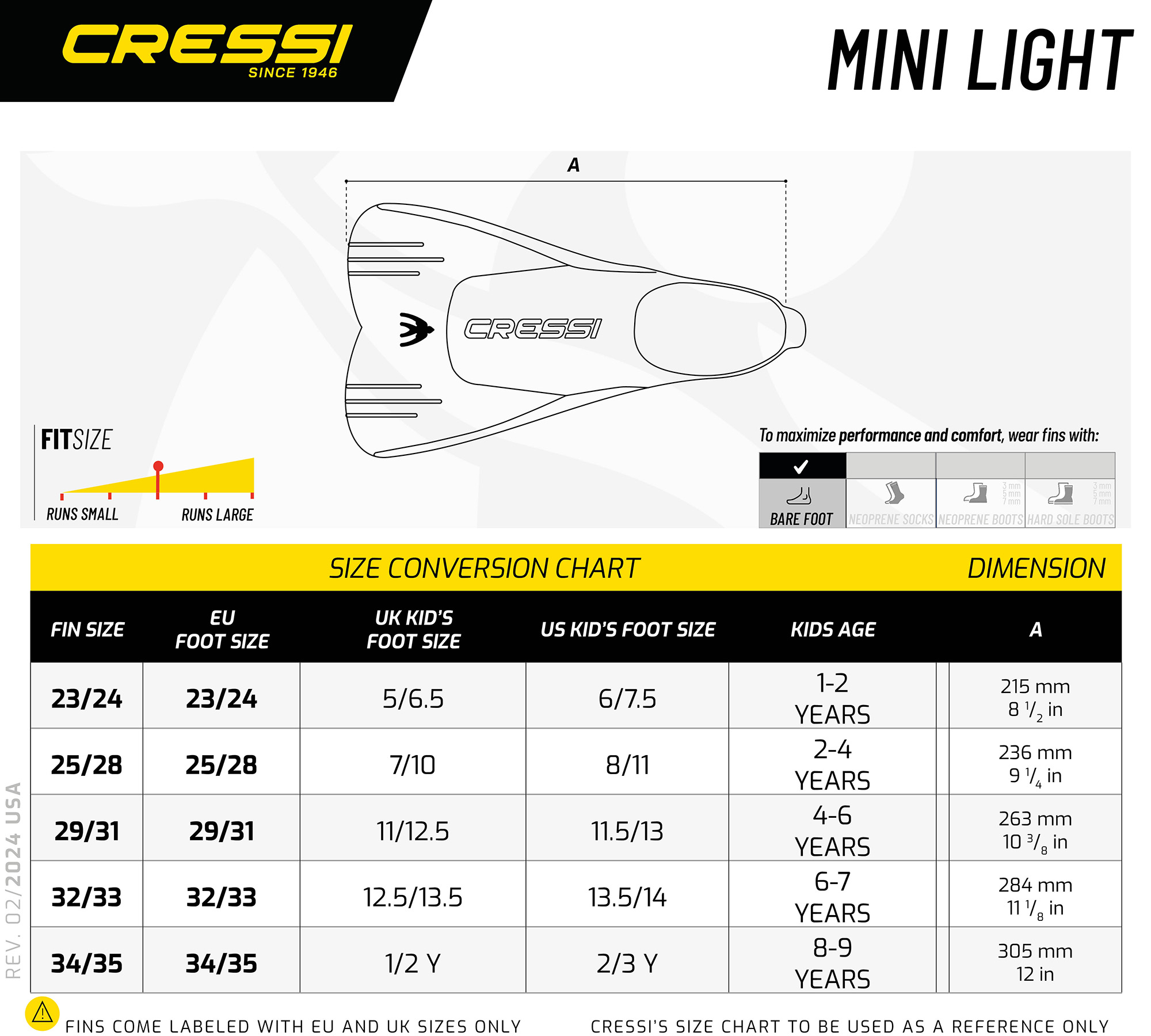 Fin with short blade 100% natural rubber. This material has a great resistance to breakage and abrasion damage that makes it suitable for use by children both at sea and in the pool. The fin is designed with the shoe in the middle of the blade, so that the transmission of force is effective, with a progressive motion and pleasant for the swimmer, reducing the hydrodynamic resistance of the upper part of the foot. The sole has a calculated rigidity to avoid cramping at the sole of the foot. The rear part of the shoe is thicker, reinforced and has a tongue that facilitates its positioning. All the edges in contact with the skin are rounded for greater comfort. The very soft and comfortable elastomer (thermoplastic rubber), which surrounds the upper part of the shoe and the side spars, helps the stability of the fin during swimming. For shops on the coast, the option of a high-strength short fin is also particularly interesting as an aid to swimming, for light snorkeling and as protection, especially in rocky areas