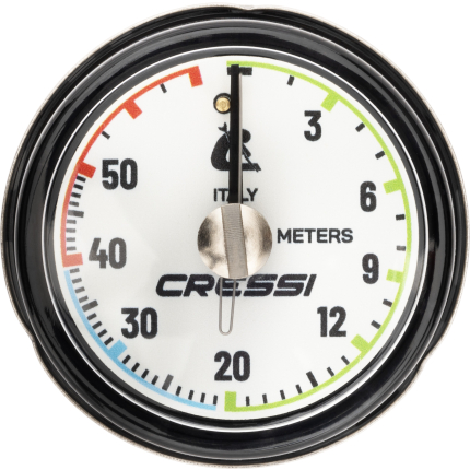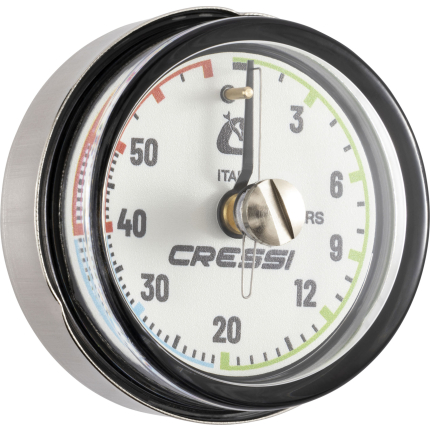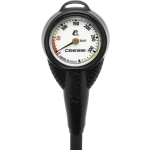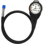 This durable mini-gauge offers a color-coded dial in red, green, and blue for easy readability, measuring pressures up to 350 bar or 5000 psi. Encased in chrome-plated brass, it ensures long-lasting performance. The compact, textured rubber boot provides a secure grip, and the top connection loop is ideal for attaching clips or bungees, enhancing its practicality.