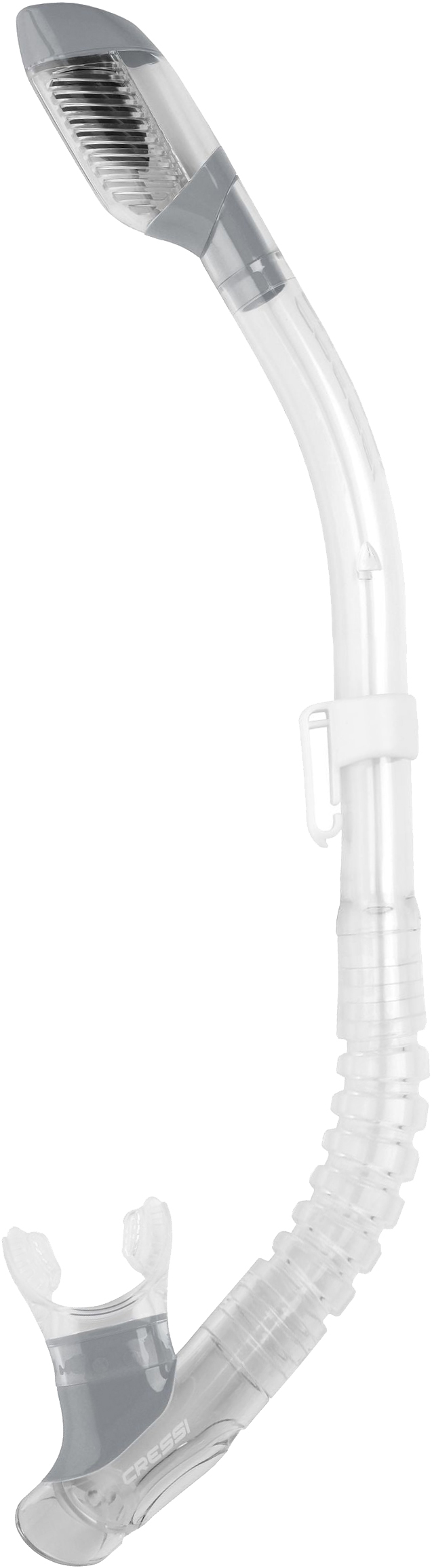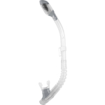Version of the dry model for women and children. The minidry snorkel has an original anti-splash end with a special valve that seals the tube as you dive, almost totally preventing the entrance of water as the snorkel is submerged. The lower end has a corrugated part that is smooth on the inside and keeps the snorkel away from the mouth when using breathing apparatus. A special water collection cup, with a large elliptic discharge valve makes expelling water quick and easy