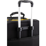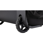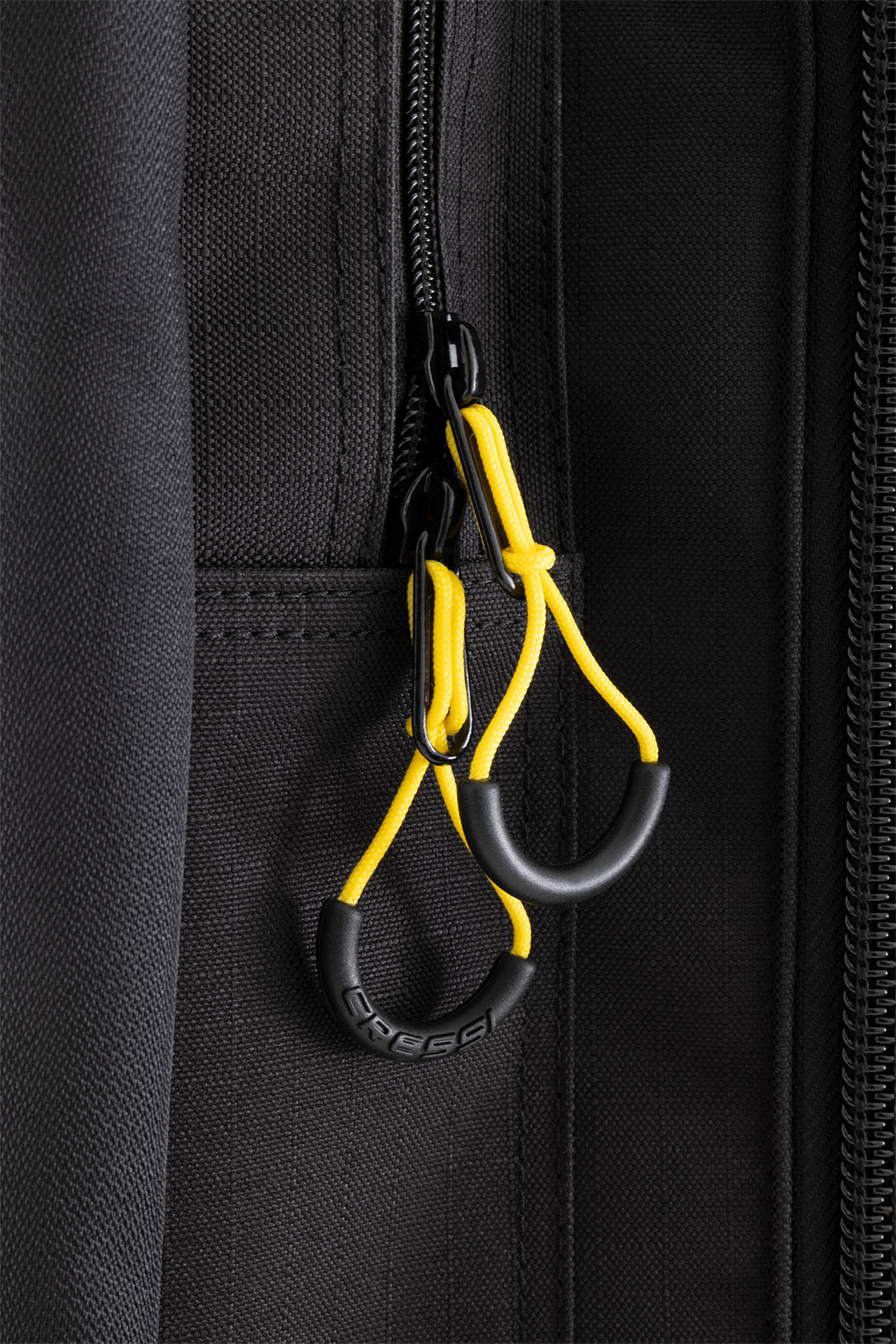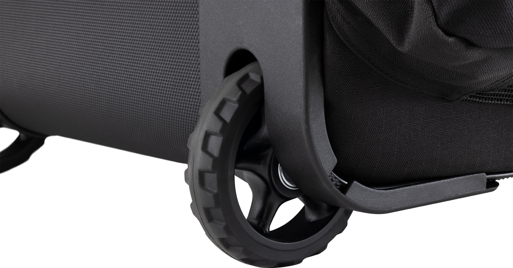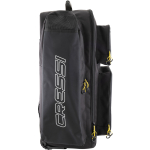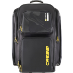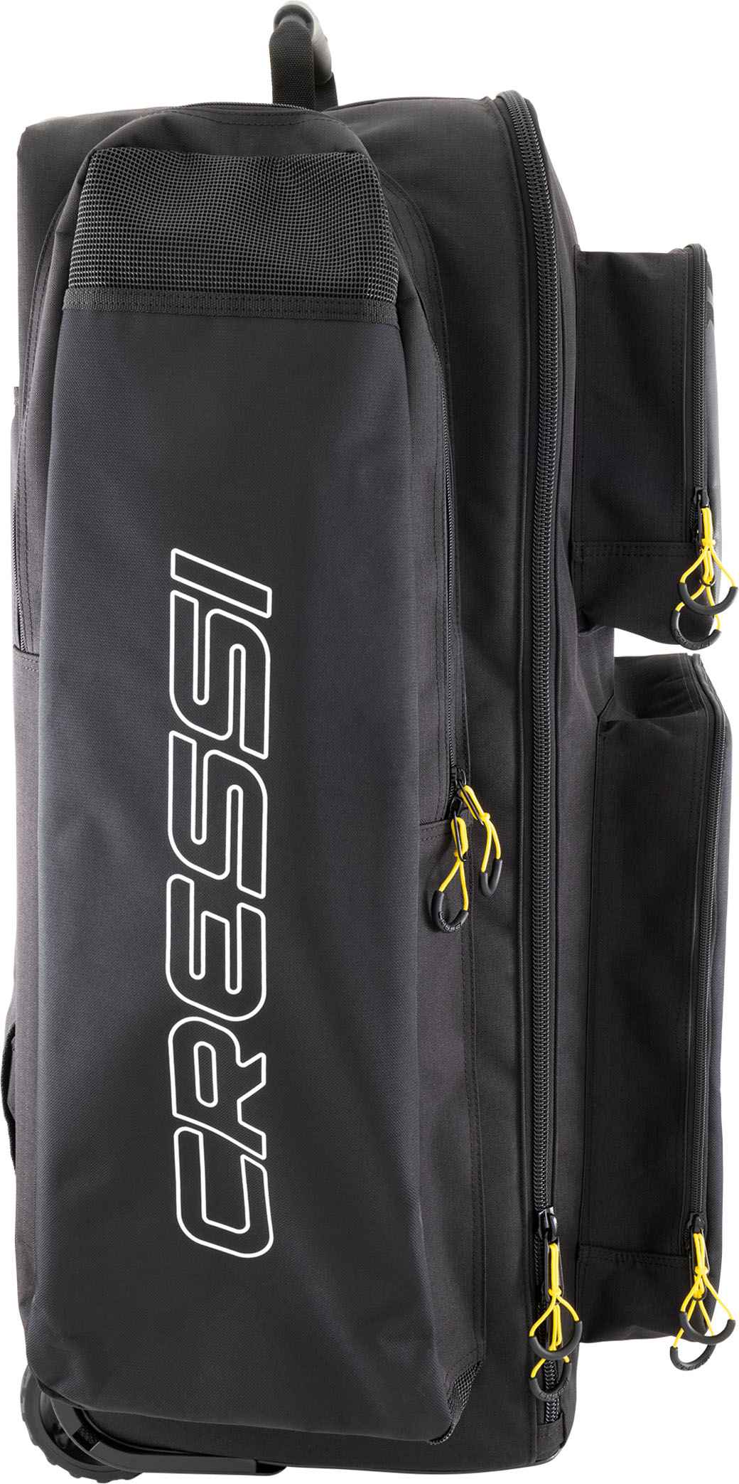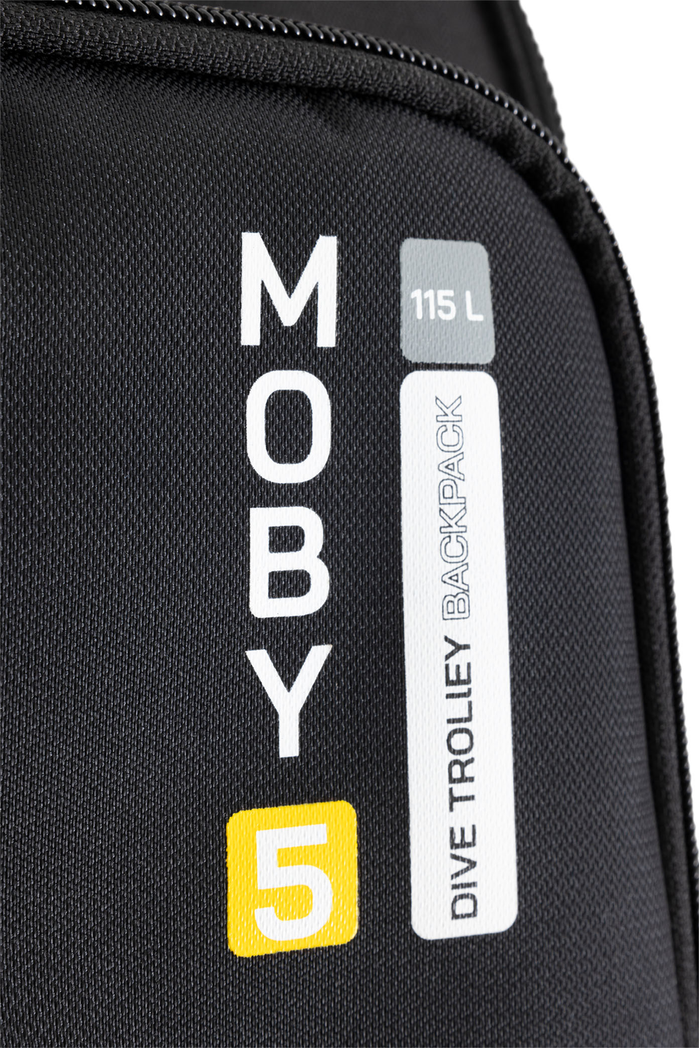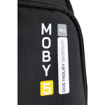 It is made from a new 300/400 denier material that is light yet very strong. The main compartment opens on three sides allowing easy access. There are two large bellows pockets to the front with zip closures, two side pockets for fins and a small upper pocket that holds an address tag. There are also two adjustable, padded, straps for carrying on the back that can be placed in special pockets when the backpack is being forwarded. The reinforced pull handle is telescopic and fully retractable. The wheels have a large diameter and can be removed and easily replaced in the event of breakage. There are two carrying handles: a reinforced one at the top and one with velcro closure at the bottom. The back of the bag houses supporting rods to keep the moby 5 in a vertical position. All the zips are very strong ykk